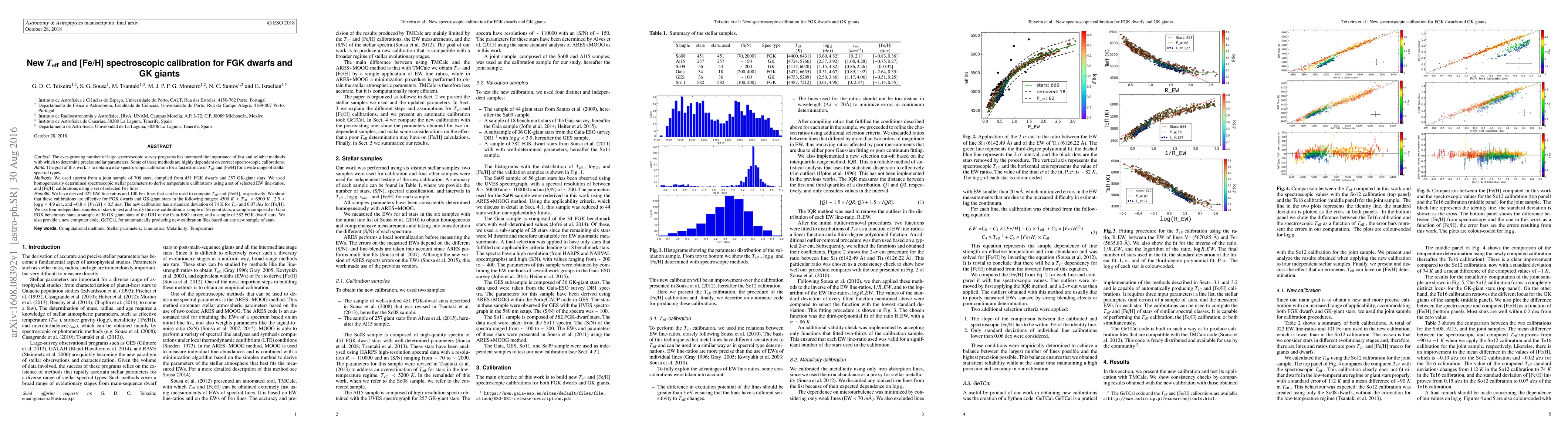 This paper presents a new spectroscopic calibration for estimating stellar temperature (Teff) and iron-to-hydrogen ratio ([Fe/H]) for FGK dwarfs and GK giants, using 708 stars from spectroscopic surveys. The calibrations, derived from 322 EW line-ratios and 100 FeI lines, show accuracy within specified ranges and are verified using four independent star samples.