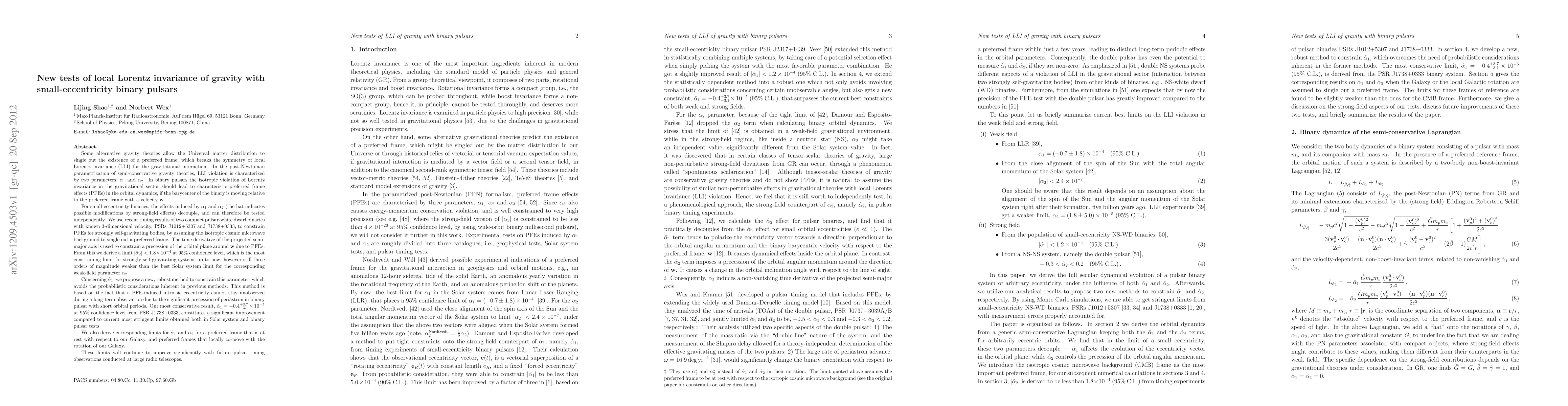 This paper investigates the local Lorentz invariance (LLI) violation in gravity using small-eccentricity binary pulsars, deriving new constraints on the parameters alpha_1 and alpha_2. The study provides a stringent limit on alpha_2 for strongly self-gravitating systems and proposes a robust method to constrain alpha_1, significantly improving previous limits.