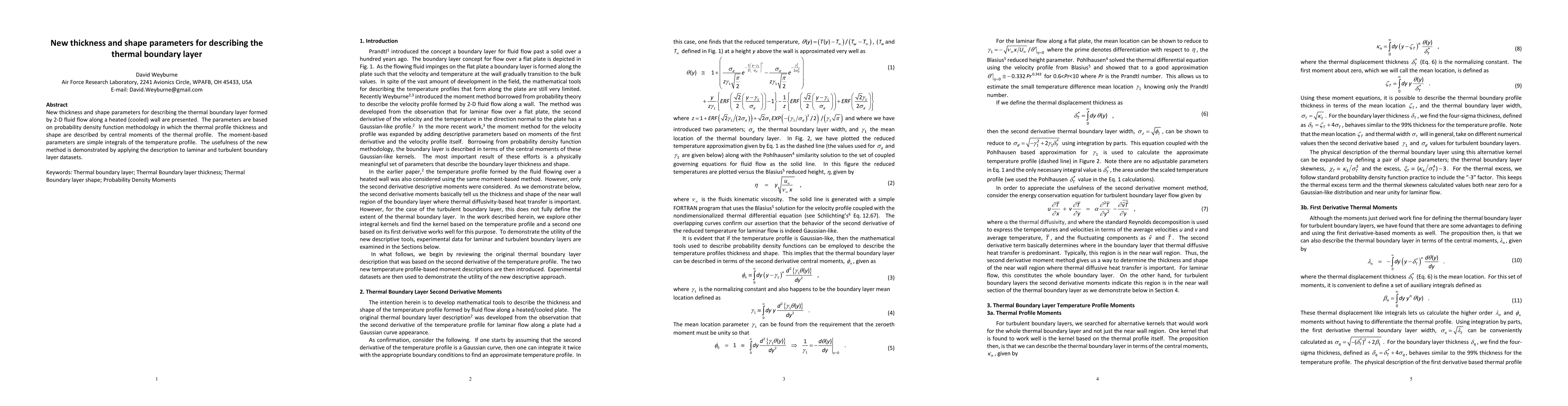 New thickness and shape parameters for describing the thermal boundary layer formed by 2-D fluid flow along a heated (cooled) wall are presented. The parameters are based on probability distribution function methodology in which the thermal profile thickness and shape are described by central moments of the thermal profile. The moment based parameters are simple integrals of the temperature profile. The usefulness of the new method is demonstrated by applying the description to laminar and turbulent boundary layer datasets.
