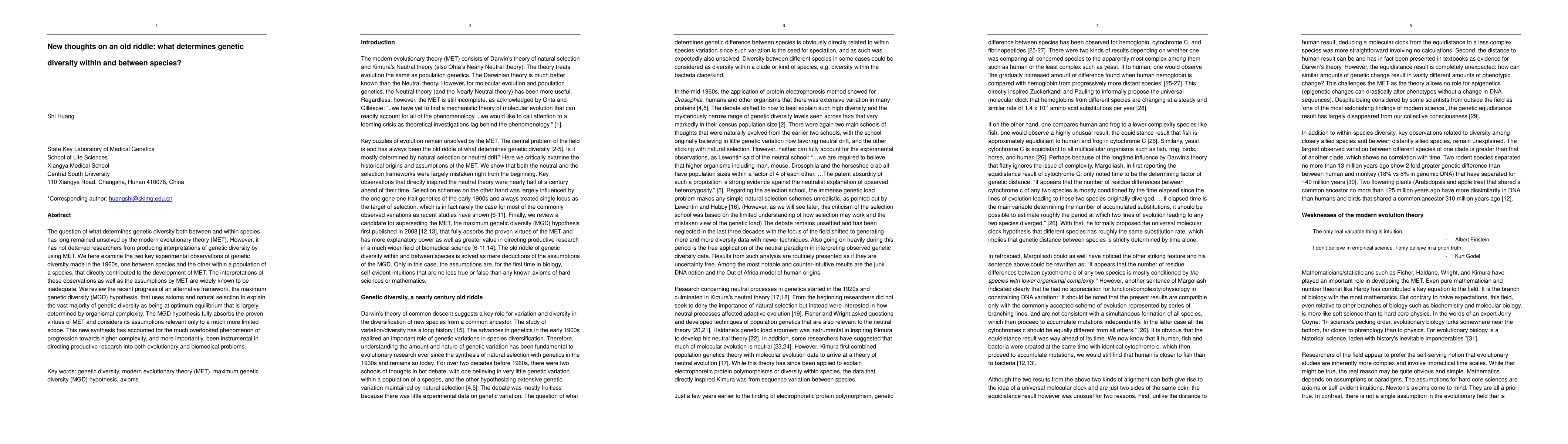 The question of what determines genetic diversity both between and within species has long remained unsolved by the modern evolutionary theory (MET). However, it has not deterred researchers from producing interpretations of genetic diversity by using MET. We here examine the two key experimental observations of genetic diversity made in the 1960s, one between species and the other within a population of a species, that directly contributed to the development of MET. The interpretations of these observations as well as the assumptions by MET are widely known to be inadequate. We review the recent progress of an alternative framework, the maximum genetic diversity (MGD) hypothesis, that uses axioms and natural selection to explain the vast majority of genetic diversity as being at optimum equilibrium that is largely determined by organismal complexity. The MGD hypothesis fully absorbs the proven virtues of MET and considers its assumptions relevant only to a much more limited scope. This new synthesis has accounted for the much overlooked phenomenon of progression towards higher complexity, and more importantly, been instrumental in directing productive research into both evolutionary and biomedical problems.
