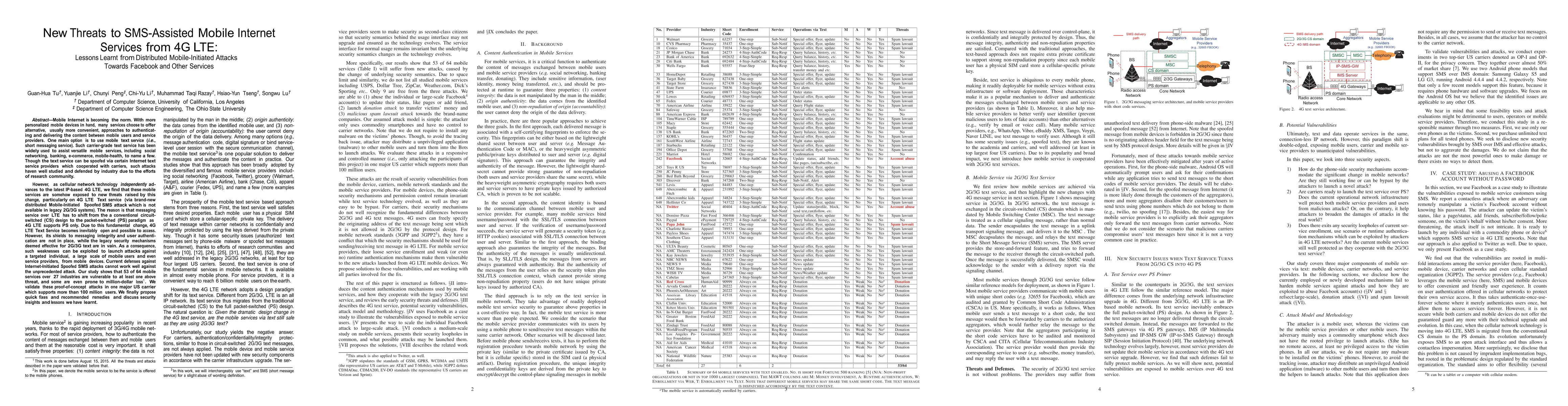 This paper investigates the new security threats posed to SMS-assisted mobile internet services by the transition to 4G LTE, particularly through distributed mobile-initiated spoofed SMS attacks. The study reveals that 53 out of 64 services across 27 industries are vulnerable, highlighting the lack of adequate defenses against these attacks compared to legacy 2G/3G systems.