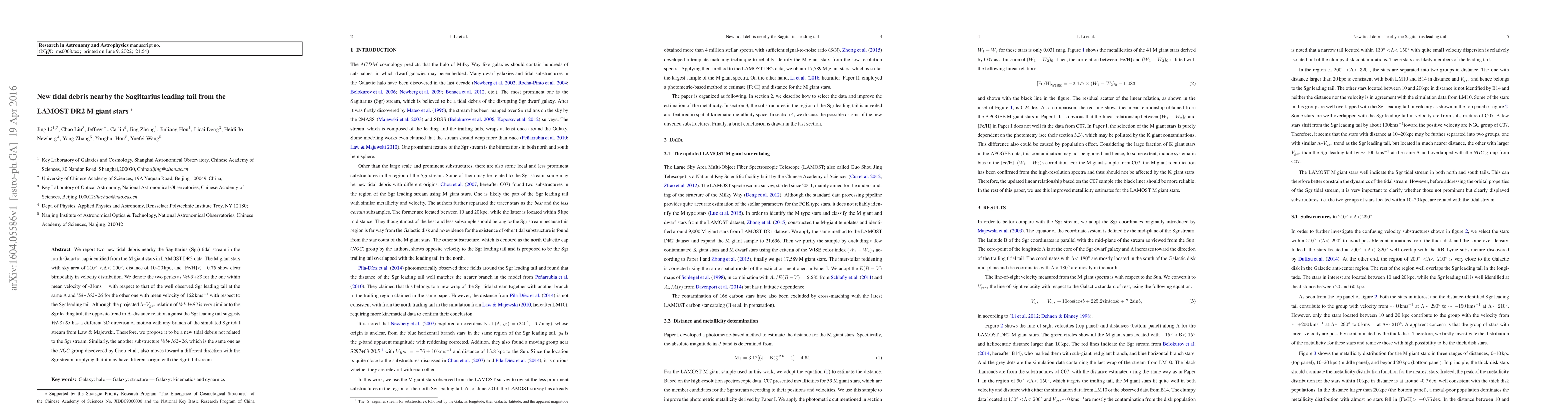 This paper identifies two new tidal debris near the Sagittarius tidal stream using M giant stars from LAMOST DR2 data. The two substructures, Vel-3+83 and Vel+162+26, show distinct velocity distributions and different 3D motion directions compared to the Sagittarius leading tail, suggesting they originate from different sources.