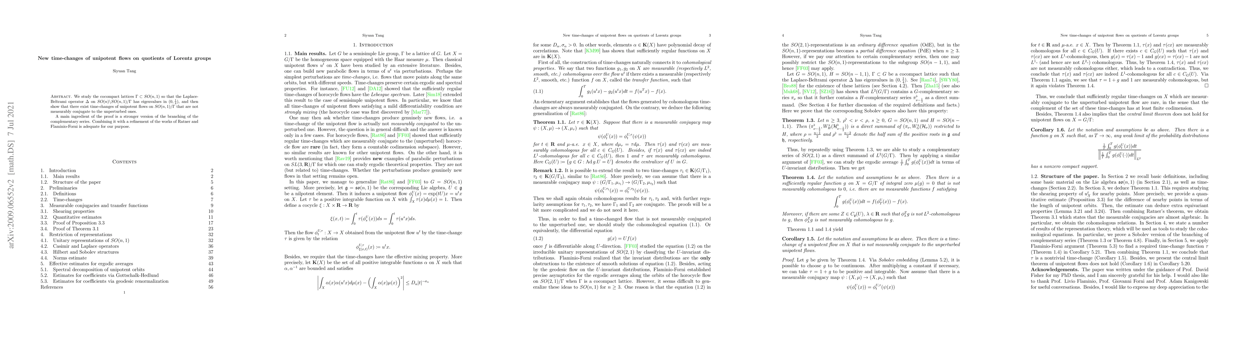 This paper investigates cocompact lattices in the Lorentz group and demonstrates that certain time-changes of unipotent flows on their quotients are not measurably conjugate to the original flows. The proof leverages a refined version of the branching of the complementary series and builds on Ratner's and Flaminio-Forni's works.