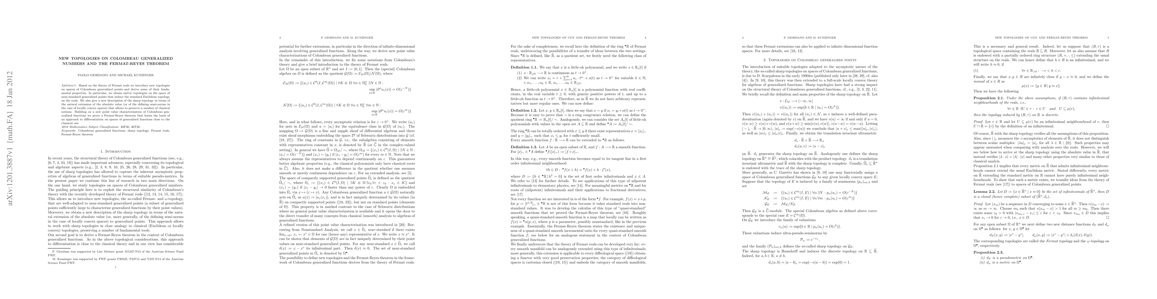 This paper introduces new topologies on Colombeau generalized numbers, deriving metric topologies that align with Euclidean topology on the reals. It also establishes a Fermat-Reyes theorem, providing a basis for differentiating generalized functions in a manner similar to classical approaches.