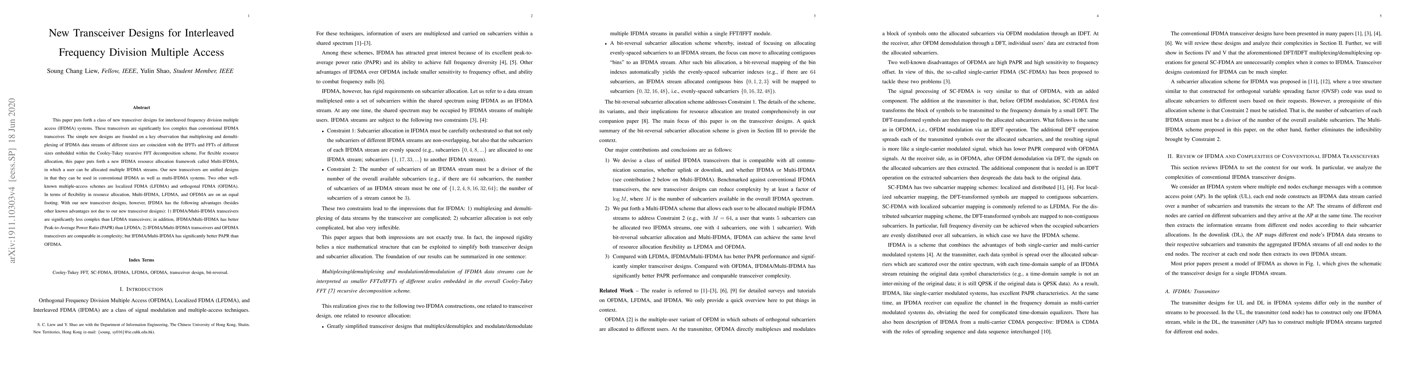 This paper puts forth a class of new transceiver designs for interleaved frequency division multiple access (IFDMA) systems. These transceivers are significantly less complex than conventional IFDMA transceiver. The simple new designs are founded on a key observation that multiplexing and demultiplexing of IFDMA data streams of different sizes are coincident with the IFFTs and FFTs of different sizes embedded within the Cooley-Tukey recursive FFT decomposition scheme. For flexible resource allocation, this paper puts forth a new IFDMA resource allocation framework called Multi-IFDMA, in which a user can be allocated multiple IFDMA streams. Our new transceivers are unified designs in that they can be used in conventional IFDMA as well as multi-IFDMA systems. Two other well-known multiple-access schemes are localized FDMA (LFDMA) and orthogonal FDMA (OFDMA). In terms of flexibility in resource allocation, Multi-IFDMA, LFDMA, and OFDMA are on an equal footing. With our new transceiver designs, however, IFDMA has the following advantages (besides other known advantages not due to our new transceiver designs): 1) IFDMA/Multi-IFDMA transceivers are significantly less complex than LFDMA transceivers; in addition, IFDMA/Multi-IFDMA has better Peak-to-Average Power Ratio (PAPR) than LFDMA; 2) IFDMA/Multi-IFDMA transceivers and OFDMA transceivers are comparable in complexity; but IFDMA/Multi-IFDMA has significantly better PAPR than OFDMA.