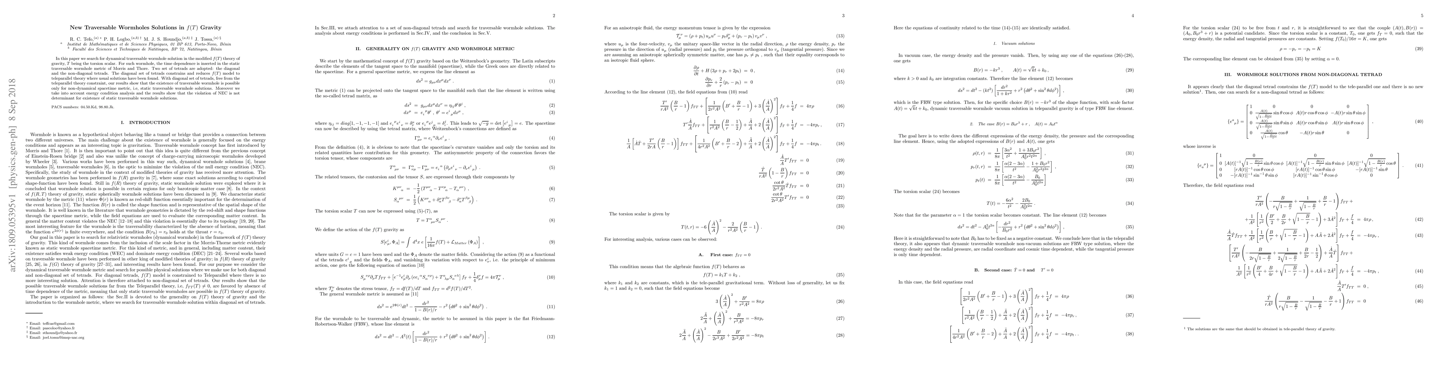 This paper explores dynamical traversable wormhole solutions in $f(T)$ gravity, modifying the static Morris and Thore metric. It finds that while diagonal tetrads constrain $f(T)$ to teleparallel theory, non-diagonal tetrads allow for static traversable wormholes, with energy condition analysis indicating that NEC violation does not necessarily determine their existence.