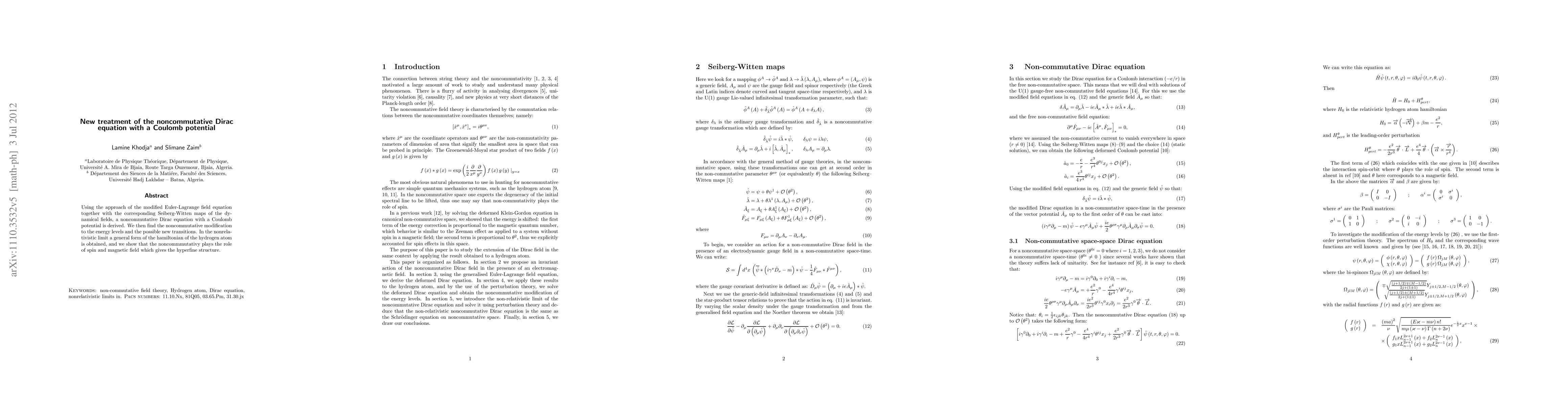 This paper derives a noncommutative Dirac equation with a Coulomb potential using modified Euler-Lagrange field equations and Seiberg-Witten maps. It explores the noncommutative modifications to energy levels and transitions, revealing a hyperfine structure influenced by noncommutativity akin to spin and magnetic field effects.