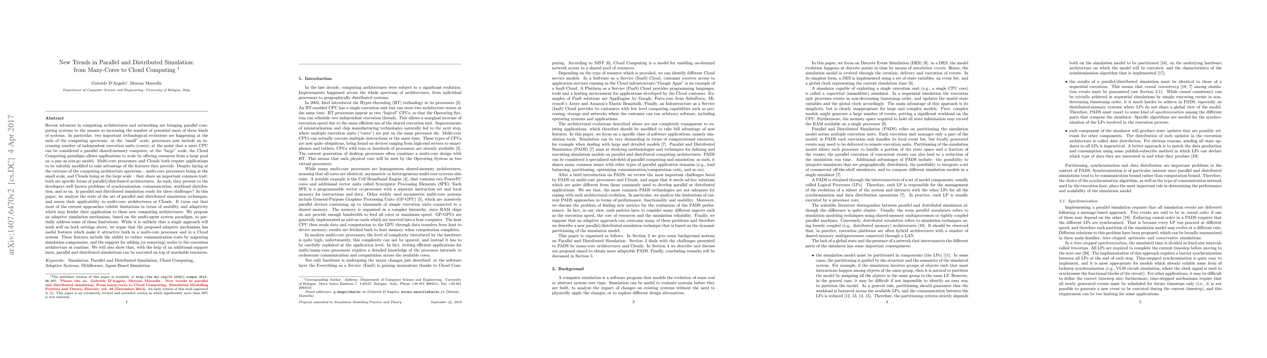 The paper analyzes parallel and distributed simulation techniques for multi-core processors and Cloud Computing, identifying limitations in current approaches. It proposes an adaptive simulation mechanism based on multi-agent systems, highlighting features like reduced communication costs and runtime node addition/removal, applicable to both multi-core and Cloud systems.