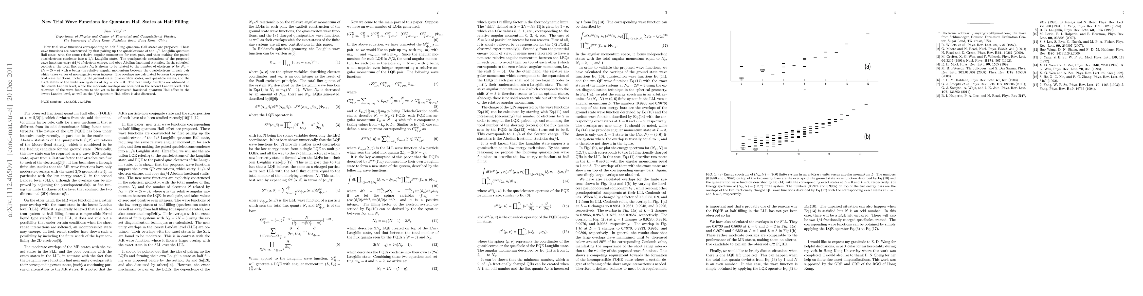This paper proposes new trial wave functions for half-filling quantum Hall states by pairing quasielectrons from the 1/3 Laughlin state to form a 1/4 Laughlin state, showing quasiparticle excitations with Abelian fractional statistics. The overlaps between these trial wave functions and exact states in finite systems show strong agreement in the lowest Landau level.
