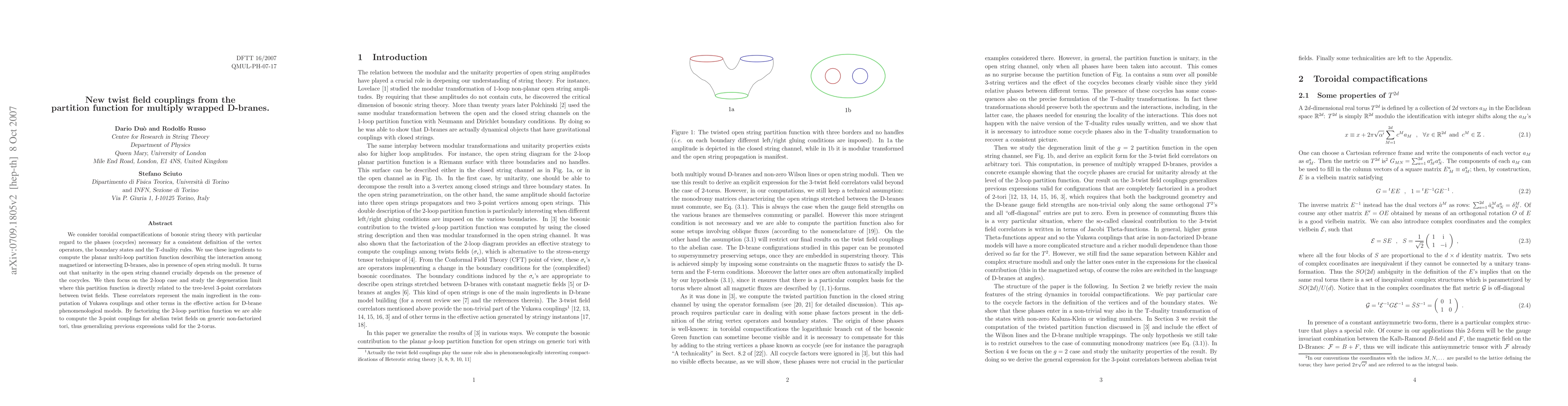 This paper investigates toroidal compactifications of bosonic string theory to determine twist field couplings for multiply wrapped D-branes, finding that unitarity depends on specific cocycles. It computes the 2-loop partition function and generalizes 3-point couplings for abelian twist fields on non-factorized tori.