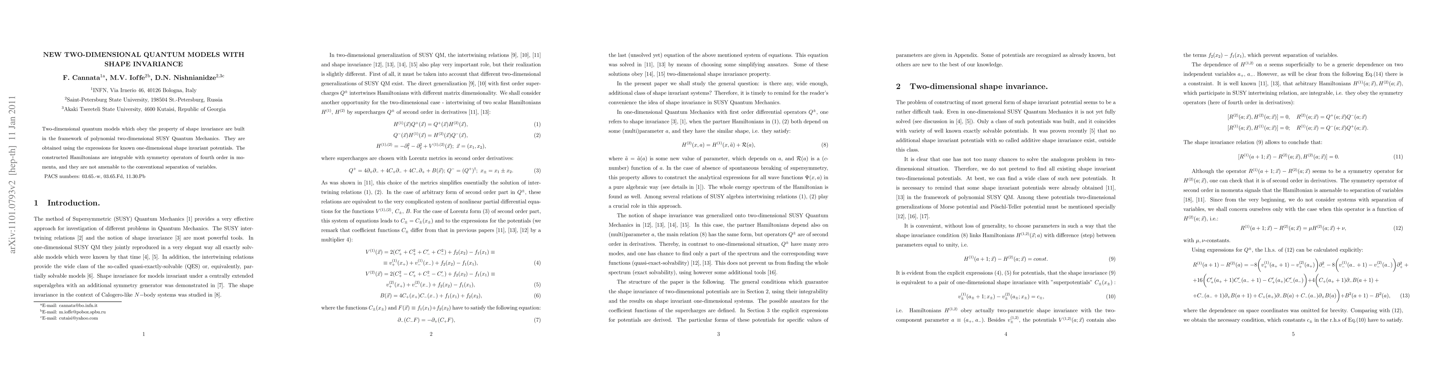 This paper constructs two-dimensional quantum models with shape invariance using polynomial two-dimensional SUSY Quantum Mechanics, derived from known one-dimensional shape invariant potentials. The resulting Hamiltonians are integrable but do not support conventional separation of variables.