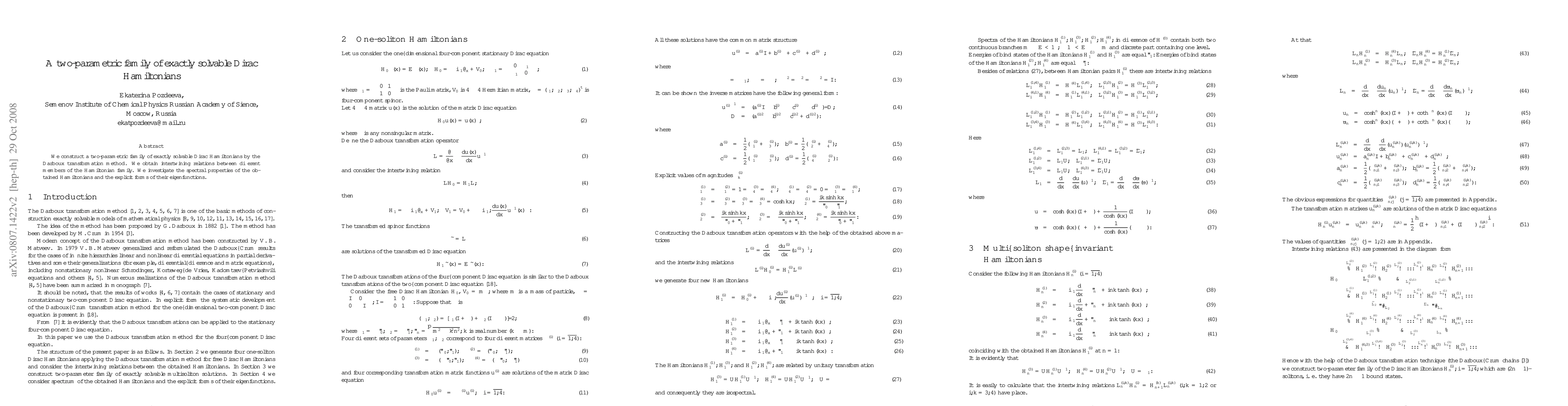 This paper introduces a two-parametric family of exactly solvable Dirac Hamiltonians using the Darboux transformation method, and explores the intertwining relations and spectral properties of these Hamiltonians, including the explicit forms of their eigenfunctions.