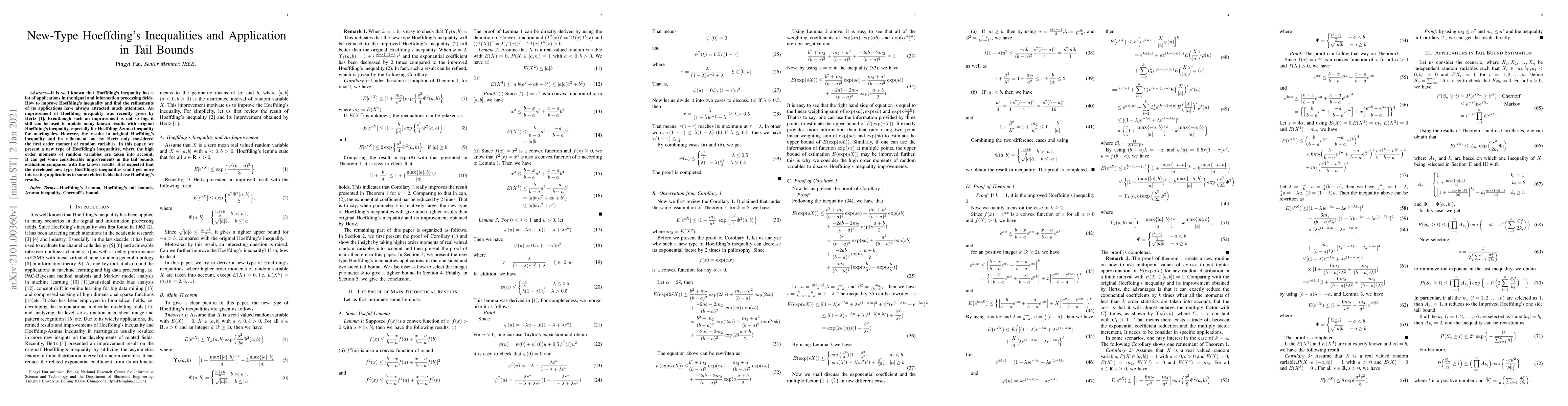 It is well known that Hoeffding's inequality has a lot of applications in the signal and information processing fields. How to improve Hoeffding's inequality and find the refinements of its applications have always attracted much attentions. An improvement of Hoeffding inequality was recently given by Hertz \cite{r1}. Eventhough such an improvement is not so big, it still can be used to update many known results with original Hoeffding's inequality, especially for Hoeffding-Azuma inequality for martingales. However, the results in original Hoeffding's inequality and its refinement one by Hertz only considered the first order moment of random variables. In this paper, we present a new type of Hoeffding's inequalities, where the high order moments of random variables are taken into account. It can get some considerable improvements in the tail bounds evaluation compared with the known results. It is expected that the developed new type Hoeffding's inequalities could get more interesting applications in some related fields that use Hoeffding's results.
