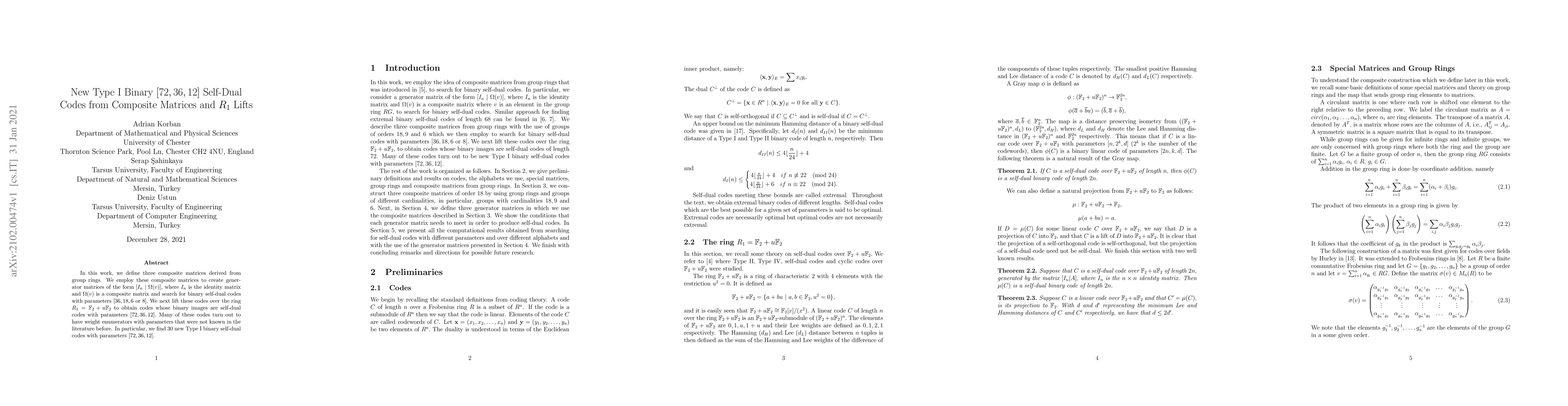 This paper introduces new Type I binary [72, 36, 12] self-dual codes derived from composite matrices and R1 lifts. The authors construct these codes using group rings and find 30 previously unknown codes with unique weight enumerators.