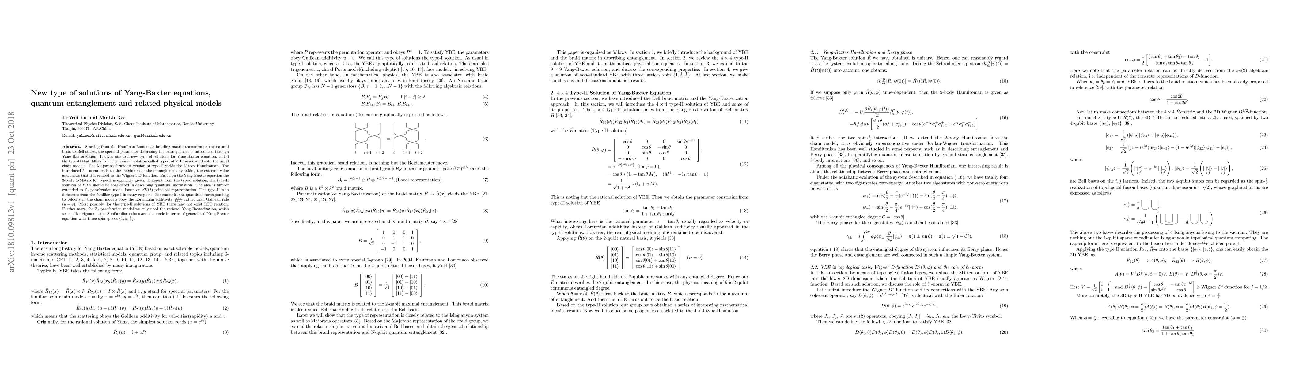 Starting from the Kauffman-Lomonaco braiding matrix transforming the natural basis to Bell states, the spectral parameter describing the entanglement is introduced through Yang-Baxterization. It gives rise to a new type of solutions for Yang-Baxter equation, called the type-II that differs from the familiar solution called type-I of YBE associated with the usual chain models. The Majorana fermionic version of type-II yields the Kitaev Hamiltonian. The introduced $\ell_1$ -norm leads to the maximum of the entanglement by taking the extreme value and shows that it is related to the Wigner's D-function. Based on the Yang-Baxter equation the 3-body S-Matrix for type-II is explicitly given. Different from the type-I solution, the type-II solution of YBE should be considered in describing quantum information. The idea is further extended to $\mathbb{Z}_3$ parafermion model based on $SU(3)$ principal representation. The type-II is in difference from the familiar type-I in many respects. For example, the quantities corresponding to velocity in the chain models obey the Lorentzian additivity $\frac{u+v}{1+uv}$ rather than Galilean rule $(u+v)$. Most possibly, for the type-II solutions of YBE there may not exist RTT relation. Further more, for $\mathbb{Z}_3$ parafermion model we only need the rational Yang-Baxterization, which seems like trigonometric. Similar discussions are also made in terms of generalized Yang-Baxter equation with three spin spaces $\{1,\frac{1}{2},\frac{1}{2}\}$.