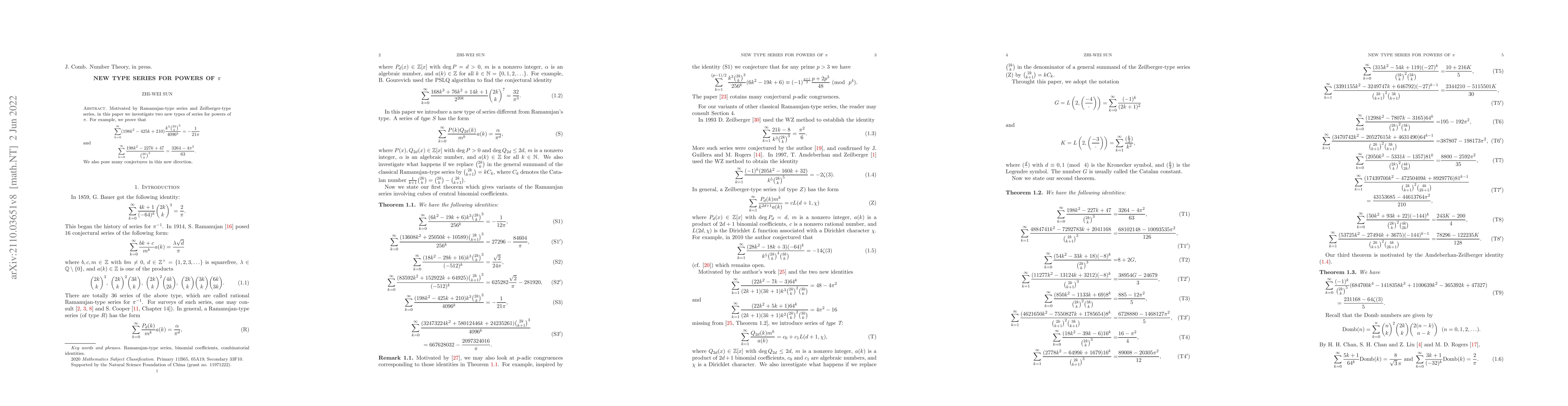 This paper introduces two novel series for powers of $\pi$ inspired by Ramanujan and Zeilberger series. It proves specific identities, such as $\sum_{k=0}^\infty(198k^2-425k+210)\frac{k^3\binom{2k}k^3}{4096^k}=-\frac1{21\pi}$, and poses several conjectures for further exploration.