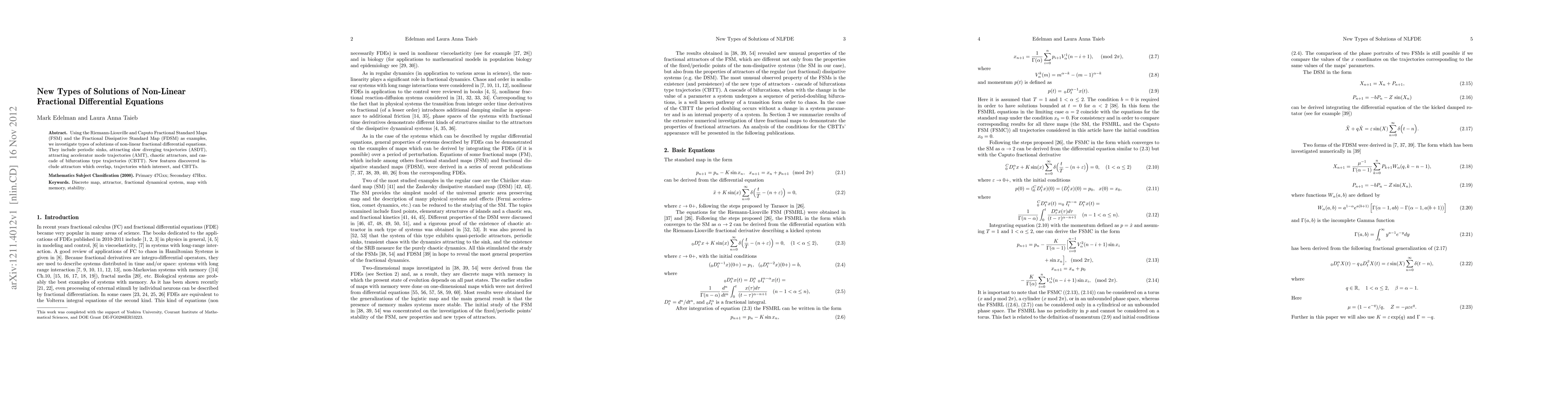Using the Riemann-Liouville and Caputo Fractional Standard Maps (FSM) and the Fractional Dissipative Standard Map (FDSM) as examples, we investigate types of solutions of non-linear fractional differential equations. They include periodic sinks, attracting slow diverging trajectories (ASDT), attracting accelerator mode trajectories (AMT), chaotic attractors, and cascade of bifurcations type trajectories (CBTT). New features discovered include attractors which overlap, trajectories which intersect, and CBTTs.