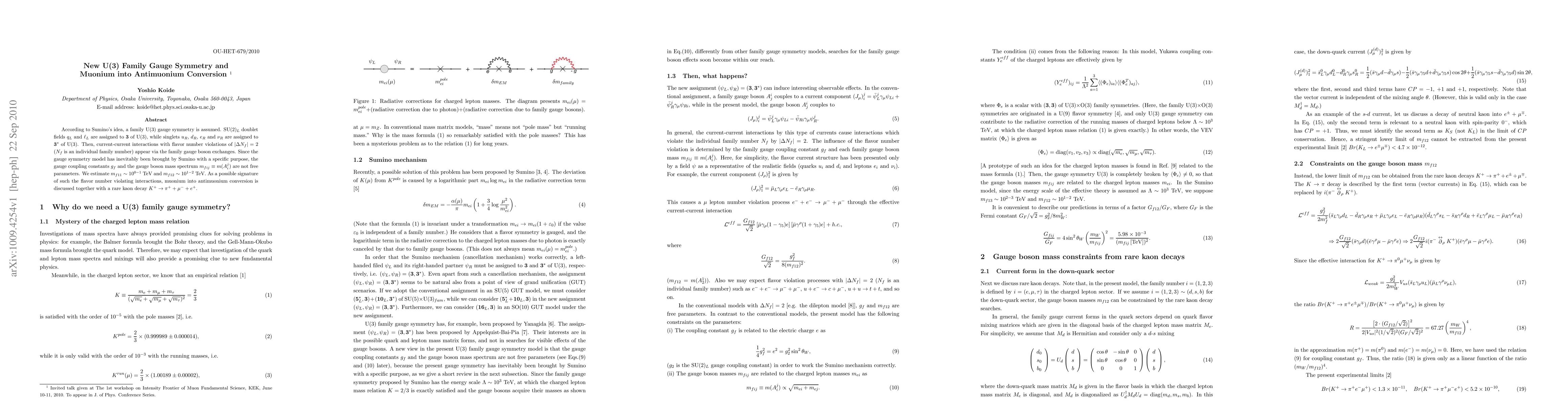 According to Sumino's idea, a family U(3) gauge symmetry is assumed. SU(2)$_L$ doublet fields $q_L$ and $\ell_L$ are assigned to {\bf 3} of U(3), while singlets $u_R$, $d_R$, $e_R$ and $\nu_R$ are assigned to {\bf 3$^*$} of U(3). Then, current-current interactions with flavor number violations of $|\Delta N_{f}|=2$ ($N_{f}$ is an individual family number) appear via the family gauge boson exchanges. Since the gauge symmetry model has inevitably been brought by Sumino with a specific purpose, the gauge coupling constants g_f and the gauge boson mass spectrum m_{fij}\equiv m(A_i^j) are not free parameters. We estimate m_{f11} \sim 10^{0-1} TeV and m_{f12} \sim 10^{1-2} TeV. As a possible signature of such the flavor number violating interactions, muonium into antimuonium conversion is discussed together with a rare kaon decay K^+ \rightarrow \pi^+ + \mu^- +e^+.