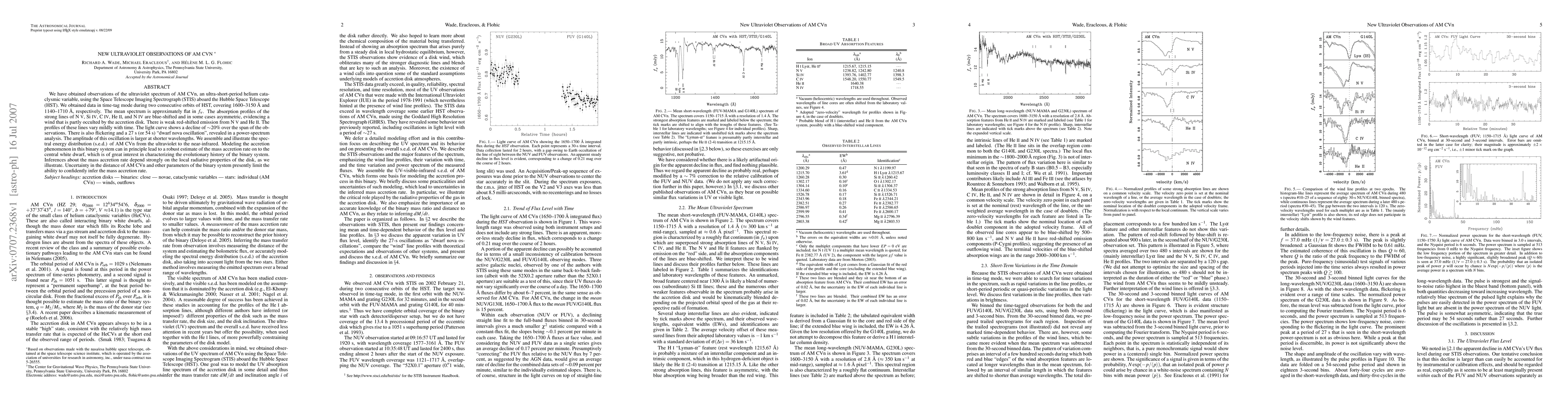 Researchers observed AM CVn in ultraviolet light using Hubble Space Telescope, finding a flat spectrum with blue-shifted absorption lines indicating a wind occluded by the accretion disk, as well as flickering and dwarf nova oscillations.