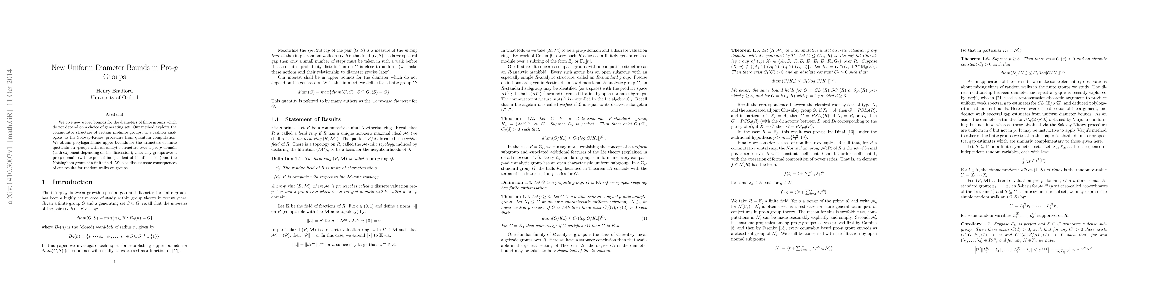 We give new upper bounds for the diameters of finite groups which do not depend on a choice of generating set. Our method exploits the commutator structure of certain profinite groups, in a fashion analogous to the Solovay-Kitaev procedure from quantum computation. We obtain polylogarithmic upper bounds for the diameters of finite quotients of: groups with an analytic structure over a pro-$p$ domain (with exponent depending on the dimension); Chevalley groups over a pro-$p$ domain (with exponent independent of the dimension) and the Nottingham group of a finite field. We also discuss some consequences of our results for random walks on groups.