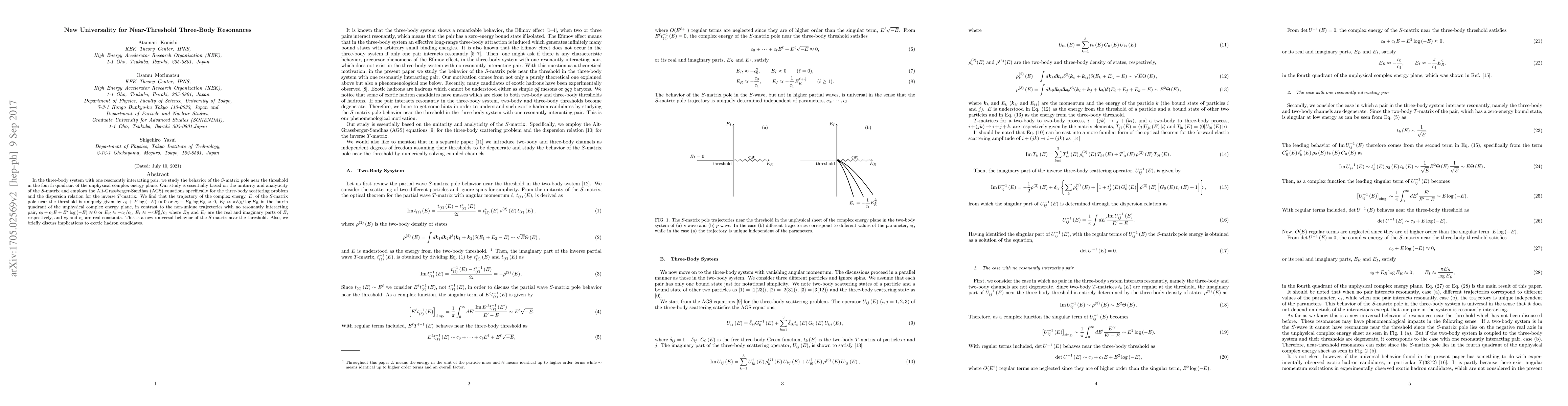 In the three-body system with one resonantly interacting pair, we study the behavior of the $S$-matrix pole near the threshold in the fourth quadrant of the unphysical complex energy plane. Our study is essentially based on the unitarity and analyticity of the $S$-matrix and employs the Alt-Grassberger-Sandhas (AGS) equations specifically for the three-body scattering problem and the dispersion relation for the inverse $T$-matrix. We find that the trajectory of the complex energy, $E$, of the $S$-matrix pole near the threshold is uniquely given by $c_0 + E \log{\left( - E \right)} \approx 0$ or $c_0 + E_R \log E_R \approx 0$, $E_I \approx \pi E_R/\log E_R$ in the fourth quadrant of the unphysical complex energy plane, in contrast to the non-unique trajectories with no resonantly interacting pair, $c_0 + c_1 E + E^2 \log{\left( - E \right)} \approx 0$ or $E_R \approx -c_0/c_1$, $E_I \approx -\pi E_R^2/c_1$ where $E_R$ and $E_I$ are the real and imaginary parts of $E$, respectively, and $c_0$ and $c_1$ are real constants. This is a new universal behavior of the $S$-matrix near the threshold. Also, we briefly discuss implications to exotic hadron candidates.