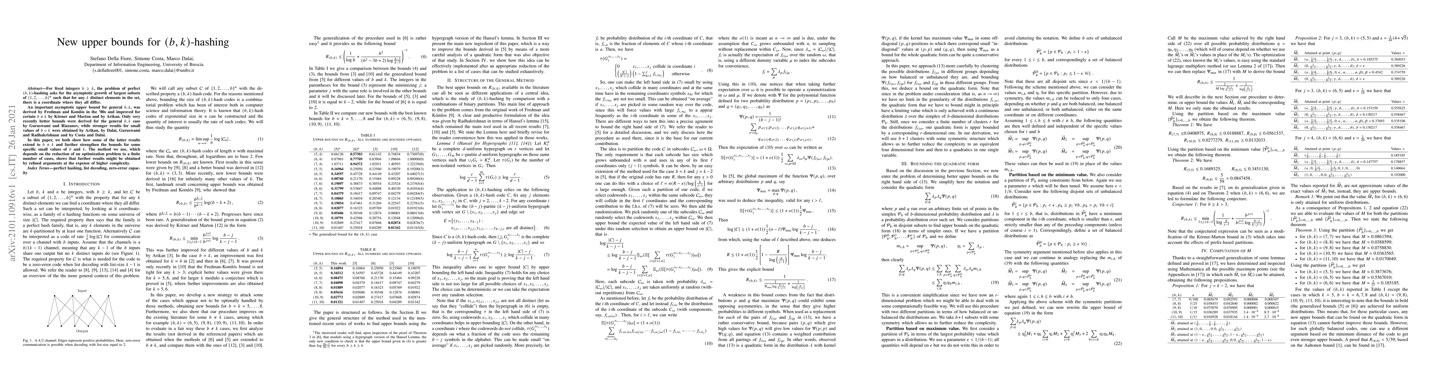 This paper presents new upper bounds for $(b,k)$-hashing, extending and strengthening previous results for specific small values of $b$ and $k$ by leveraging an optimization problem reduction technique. The method suggests that further improvements could be achieved with more complex arguments.