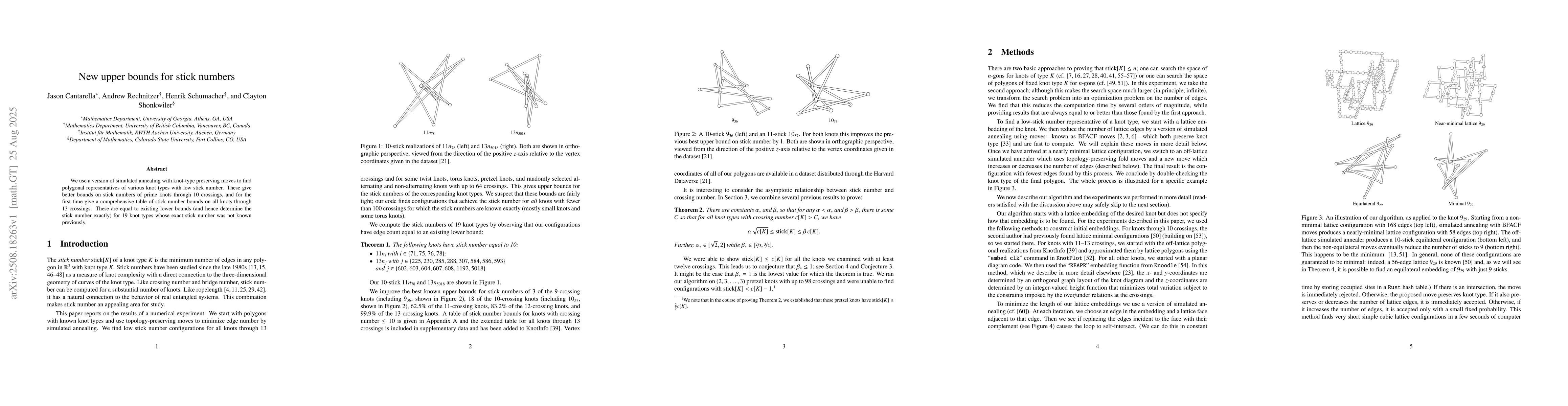 We use a version of simulated annealing with knot-type preserving moves to find polygonal representatives of various knot types with low stick number. These give better bounds on stick numbers of prime knots through 10 crossings, and for the first time give a comprehensive table of stick number bounds on all knots through 13 crossings. These are equal to existing lower bounds (and hence determine the stick number exactly) for 19 knot types whose exact stick number was not known previously.
