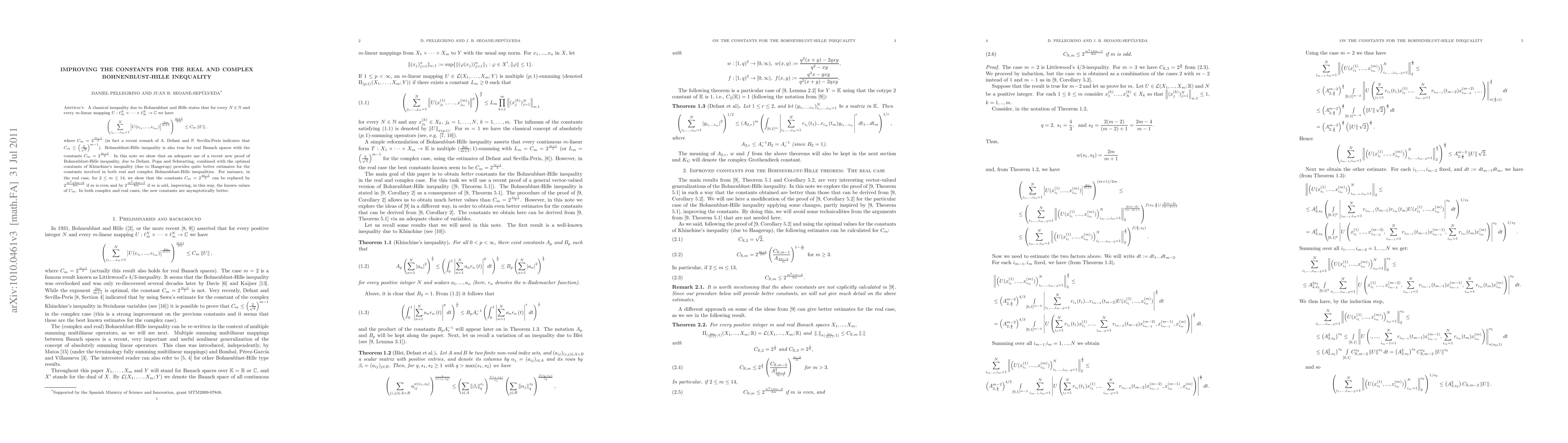 A classical inequality due to Bohnenblust and Hille states that for every positive integer $m$ there is a constant $C_{m}>0$ so that $$(\sum\limits_{i_{1},...,i_{m}=1}^{N}|U(e_{i_{^{1}}},...,e_{i_{m}})| ^{\frac{2m}{m+1}}) ^{\frac{m+1}{2m}}\leq C_{m}| U|$$ for every positive integer $N$ and every $m$-linear mapping $U:\ell_{\infty}^{N}\times...\times\ell_{\infty}^{N}\rightarrow\mathbb{C}$, where $C_{m}=m^{\frac{m+1}{2m}}2^{\frac{m-1}{2}}.$ The value of $C_{m}$ was improved to $C_{m}=2^{\frac{m-1}{2}}$ by S. Kaijser and more recently H. Qu\'{e}ffelec and A. Defant and P. Sevilla-Peris remarked that $C_{m}=(\frac{2}{\sqrt{\pi}})^{m-1}$ also works. The Bohnenblust--Hille inequality also holds for real Banach spaces with the constants $C_{m}=2^{\frac{m-1}{2}}$. In this note we show that a recent new proof of the Bohnenblust--Hille inequality (due to Defant, Popa and Schwarting) provides, in fact, quite better estimates for $C_{m}$ for all values of $m \in \mathbb{N}$. In particular, we will also show that, for real scalars, if $m$ is even with $2\leq m\leq 24$, then $$C_{\mathbb{R},m}=2^{1/2}C_{\mathbb{R},m/2}.$$ We will mainly work on a paper by Defant, Popa and Schwarting, giving some remarks about their work and explaining how to, numerically, improve the previously mentioned constants.