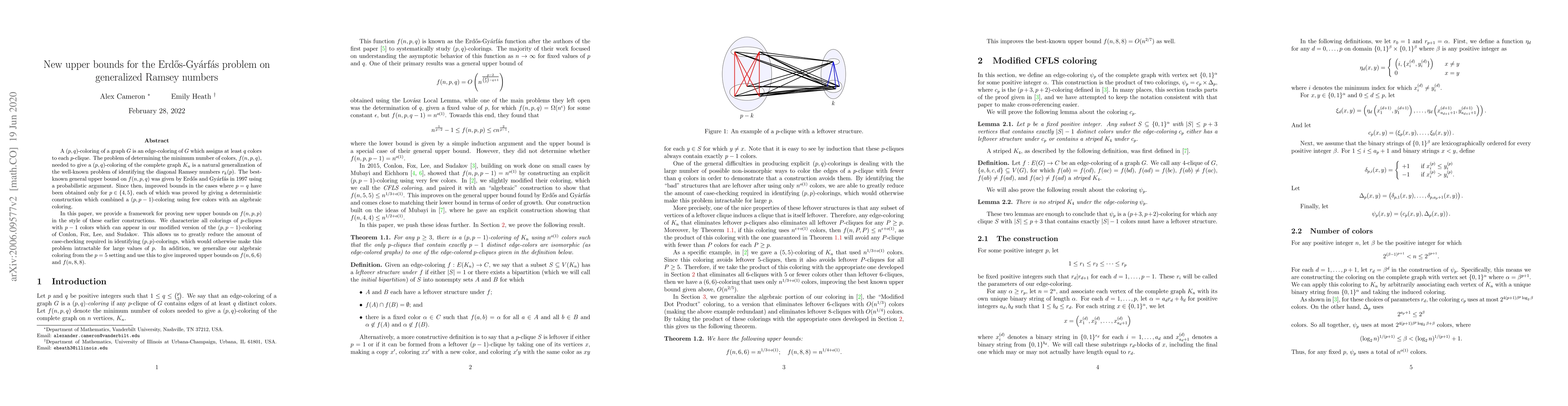 A $(p,q)$-coloring of a graph $G$ is an edge-coloring of $G$ which assigns at least $q$ colors to each $p$-clique. The problem of determining the minimum number of colors, $f(n,p,q)$, needed to give a $(p,q)$-coloring of the complete graph $K_n$ is a natural generalization of the well-known problem of identifying the diagonal Ramsey numbers $r_k(p)$. The best-known general upper bound on $f(n,p,q)$ was given by Erd\H{o}s and Gy\'arf\'as in 1997 using a probabilistic argument. Since then, improved bounds in the cases where $p=q$ have been obtained only for $p\in\{4,5\}$, each of which was proved by giving a deterministic construction which combined a $(p,p-1)$-coloring using few colors with an algebraic coloring. In this paper, we provide a framework for proving new upper bounds on $f(n,p,p)$ in the style of these earlier constructions. We characterize all colorings of $p$-cliques with $p-1$ colors which can appear in our modified version of the $(p,p-1)$-coloring of Conlon, Fox, Lee, and Sudakov. This allows us to greatly reduce the amount of case-checking required in identifying $(p,p)$-colorings, which would otherwise make this problem intractable for large values of $p$. In addition, we generalize our algebraic coloring from the $p=5$ setting and use this to give improved upper bounds on $f(n,6,6)$ and $f(n,8,8)$.