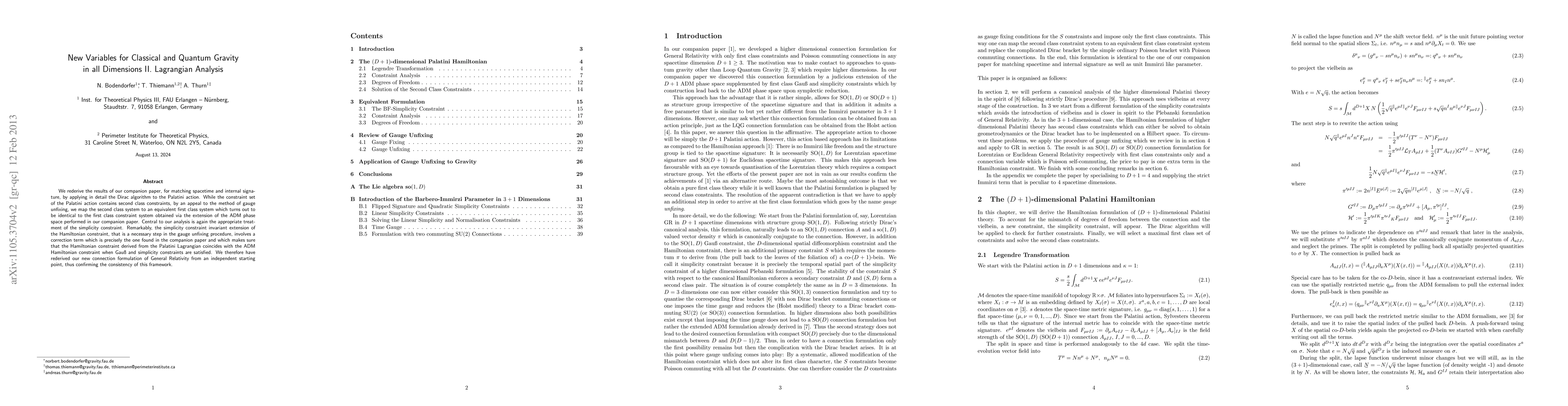 We rederive the results of our companion paper, for matching spacetime and internal signature, by applying in detail the Dirac algorithm to the Palatini action. While the constraint set of the Palatini action contains second class constraints, by an appeal to the method of gauge unfixing, we map the second class system to an equivalent first class system which turns out to be identical to the first class constraint system obtained via the extension of the ADM phase space performed in our companion paper. Central to our analysis is again the appropriate treatment of the simplicity constraint. Remarkably, the simplicity constraint invariant extension of the Hamiltonian constraint, that is a necessary step in the gauge unfixing procedure, involves a correction term which is precisely the one found in the companion paper and which makes sure that the Hamiltonian constraint derived from the Palatini Lagrangian coincides with the ADM Hamiltonian constraint when Gauss and simplicity constraints are satisfied. We therefore have rederived our new connection formulation of General Relativity from an independent starting point, thus confirming the consistency of this framework.