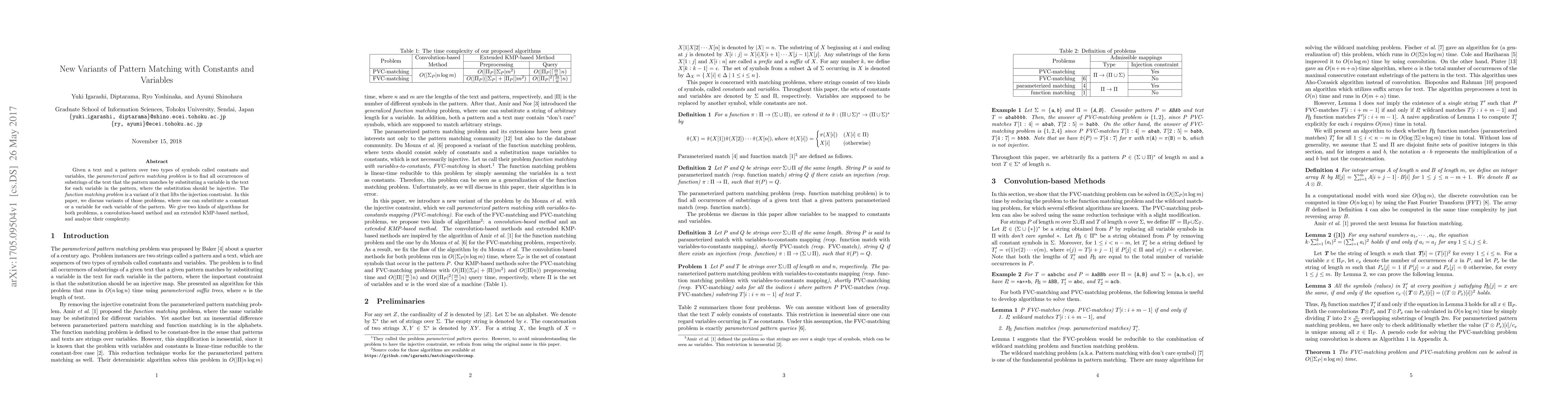 This paper explores variations of pattern matching problems involving constants and variables in texts, presenting two algorithmic approaches: convolution-based and extended KMP-based methods. It also provides complexity analysis for these algorithms.