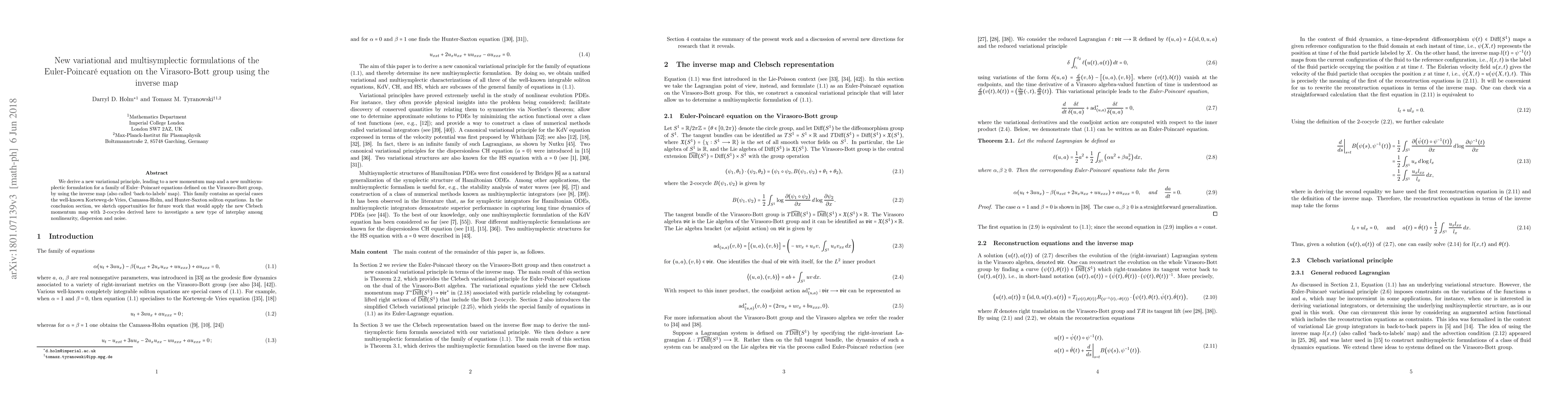 This paper introduces a novel variational principle and multisymplectic formulation for Euler-Poincaré equations on the Virasoro-Bott group, utilizing the inverse map. It extends to notable soliton equations like KdV, Camassa-Holm, and Hunter-Saxton, and hints at future research exploring the interplay of nonlinearity, dispersion, and noise.