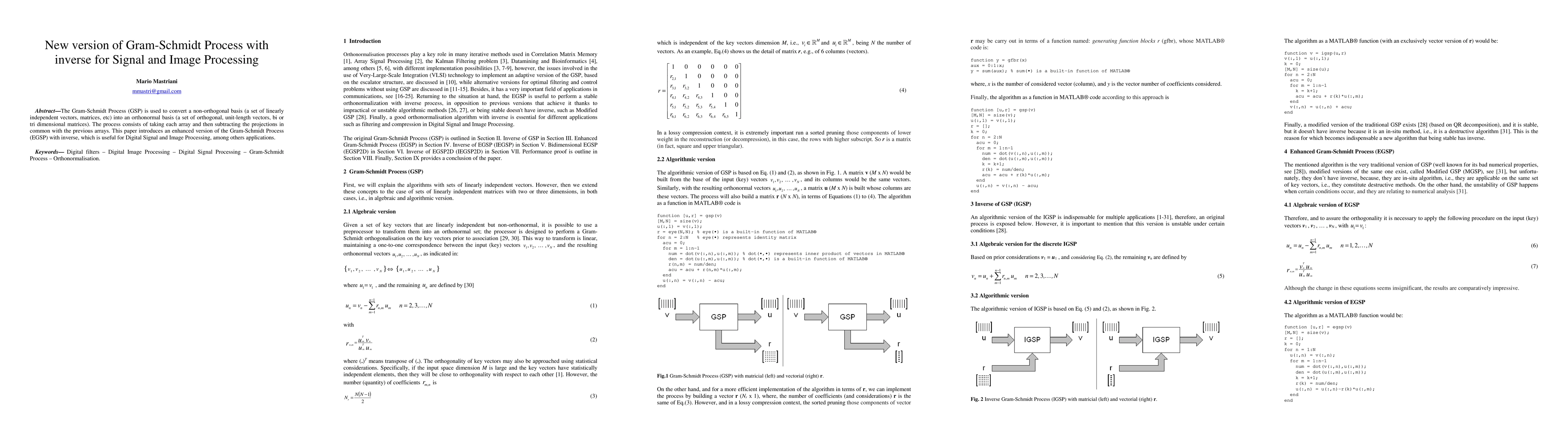 The Gram-Schmidt Process (GSP) is used to convert a non-orthogonal basis (a set of linearly independent vectors, matrices, etc) into an orthonormal basis (a set of orthogonal, unit-length vectors, bi or tri dimensional matrices). The process consists of taking each array and then subtracting the projections in common with the previous arrays. This paper introduces an enhanced version of the Gram-Schmidt Process (EGSP) with inverse, which is useful for Digital Signal and Image Processing, among others applications.