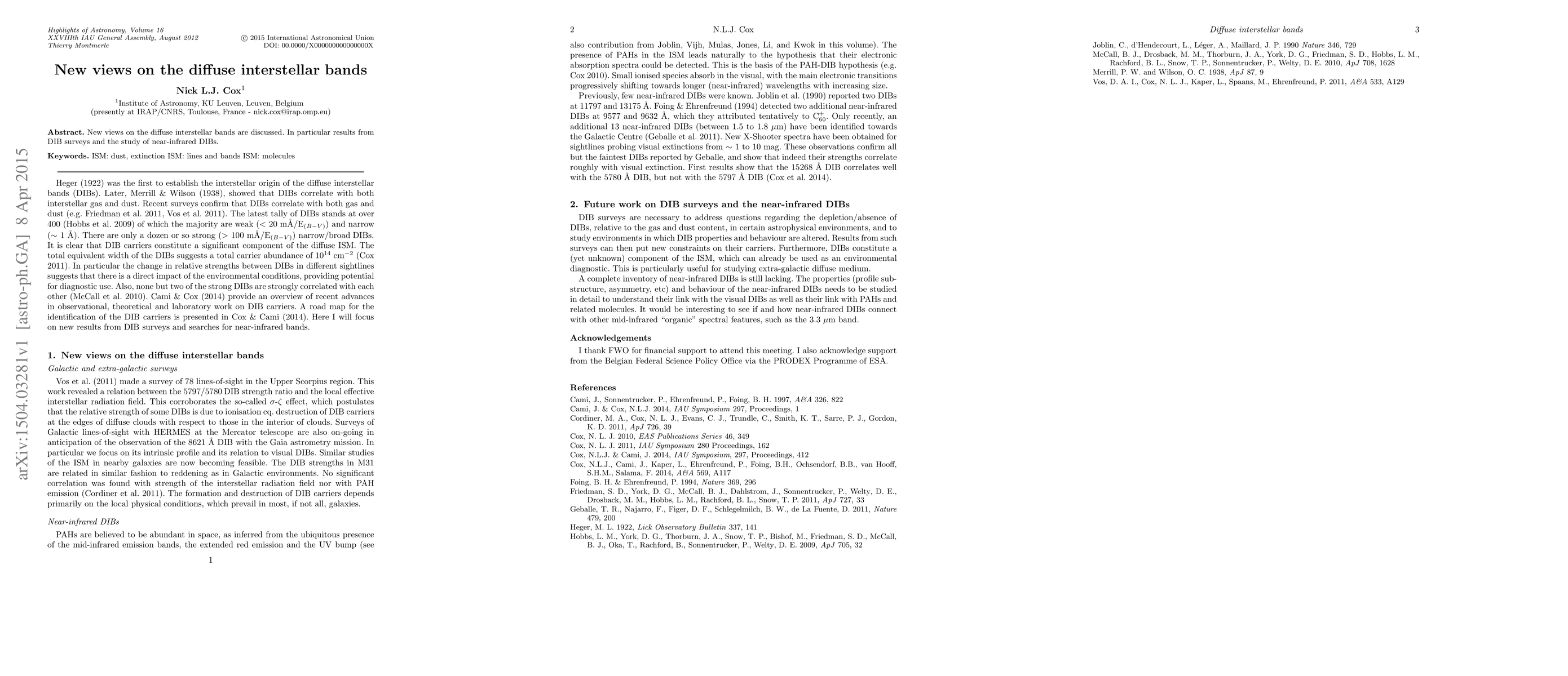 New views on the diffuse interstellar bands are discussed. In particular results from DIB surveys and the study of near-infrared DIBs.