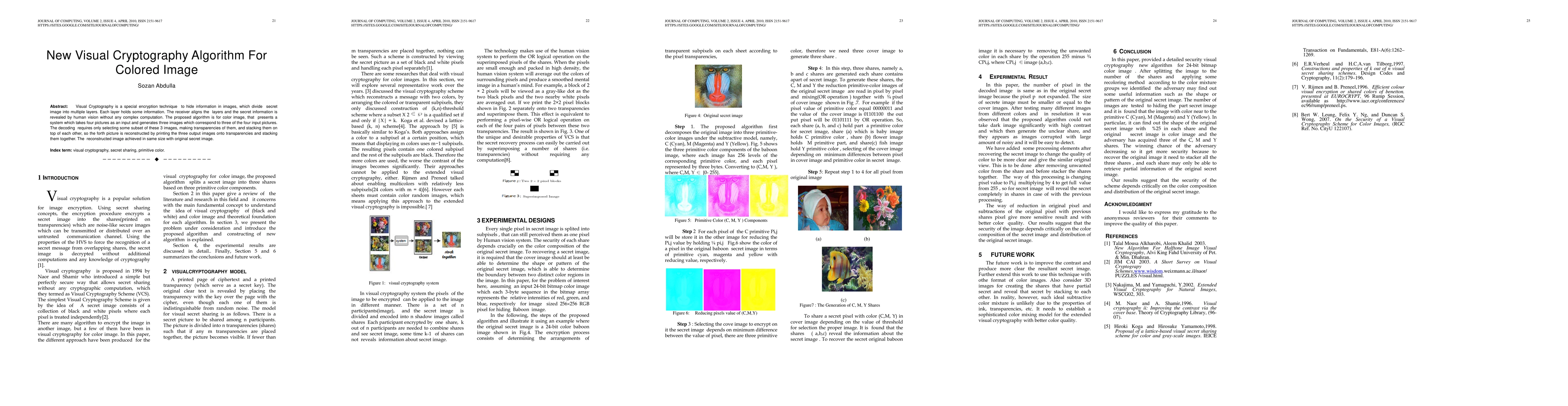 A new visual cryptography algorithm is proposed for colored images, using four input pictures to generate three output images that can be used to reconstruct the original secret image.