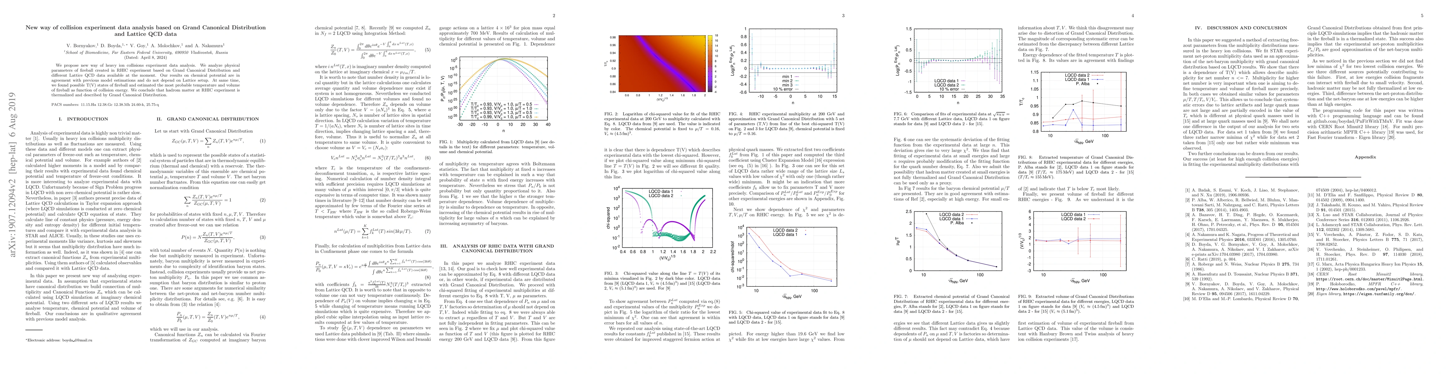 We propose new way of heavy ion collisions experiment data analysis. We analyze physical parameters of fireball created in RHIC experiment based on Grand Canonical Distribution and different Lattice QCD data available at the moment. Our results on chemical potential are in agreement with previous model estimations and do not depend on Lattice setup. At same time, we found possible T(V) states of fireball and estimated the most probable temperature and volume of fireball as function of collision energy. We conclude that hadrom matter at RHIC experiment is thermalized and described by Grand Canonical Distribution.
