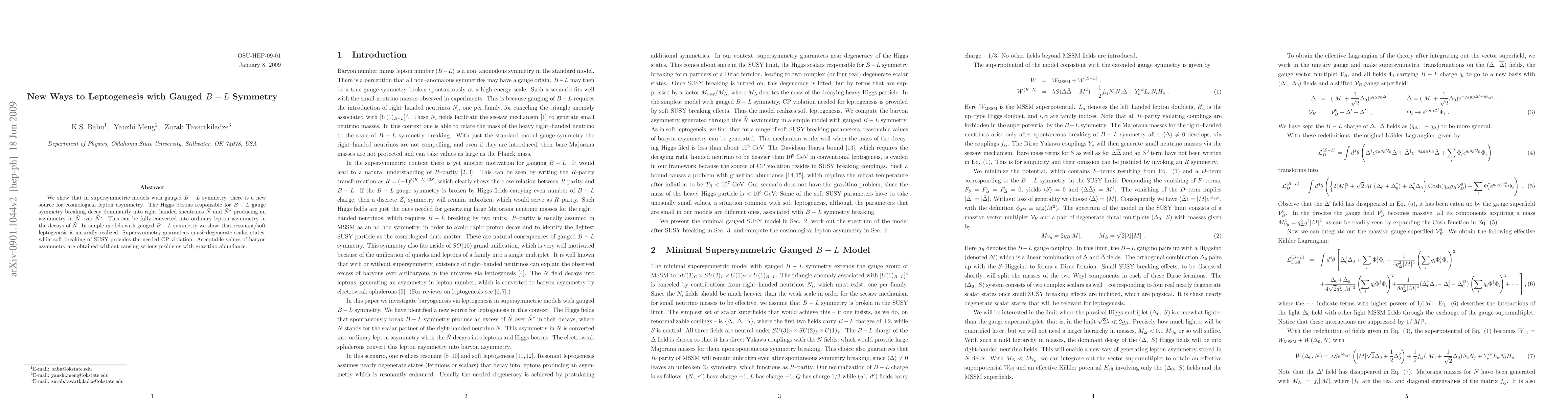 We show that in supersymmetric models with gauged B-L symmetry, there is a new source for cosmological lepton asymmetry. The Higgs bosons responsible for B-L gauge symmetry breaking decay dominantly into right-handed sneutrinos \tilde{N} and \tilde{N}* producing an asymmetry in \tilde{N} over \tilde{N}*. This can be fully converted into ordinary lepton asymmetry in the decays of \tilde{N}. In simple models with gauged B-L symmetry we show that resonant/soft leptogenesis is naturally realized. Supersymmetry guarantees quasi-degenerate scalar states, while soft breaking of SUSY provides the needed CP violation. Acceptable values of baryon asymmetry are obtained without causing serious problems with gravitino abundance.