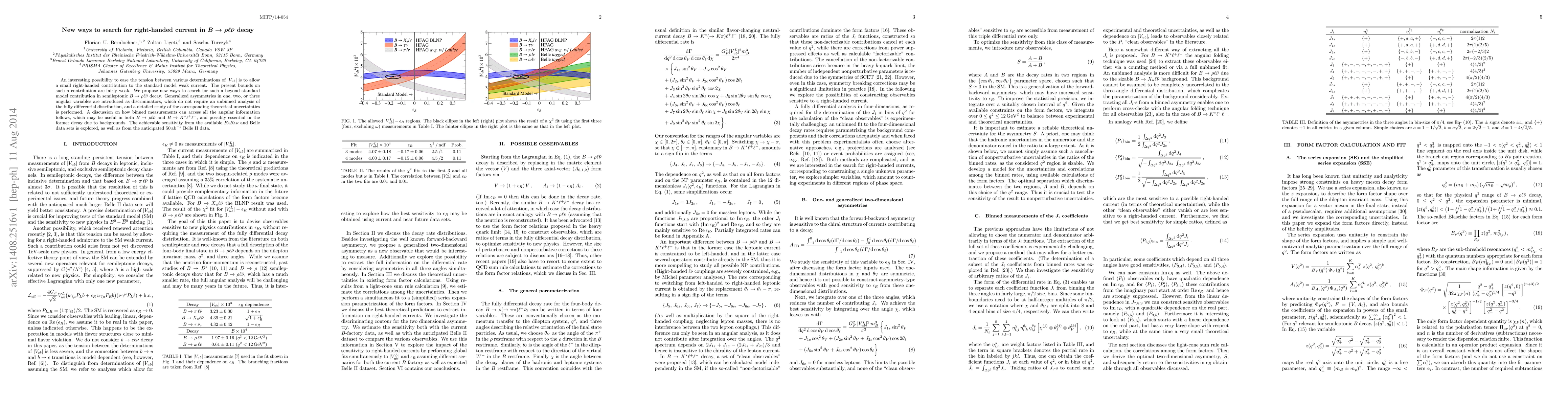 An interesting possibility to ease the tension between various determinations of |V_{ub}| is to allow a small right-handed contribution to the standard model weak current. The present bounds on such a contribution are fairly weak. We propose new ways to search for such a beyond standard model contribution in semileptonic B -> rho ell nu decay. Generalized asymmetries in one, two, or three angular variables are introduced as discriminators, which do not require an unbinned analysis of the fully differential distribution, and a detailed study of the corresponding theoretical uncertainties is performed. A discussion on how binned measurements can access all the angular information follows, which may be useful in both B -> rho ell nu and B -> K^* ell^+ ell^-, and possibly essential in the former decay due to backgrounds. The achievable sensitivity from the available BaBar and Belle data sets is explored, as well as from the anticipated 50 ab^{-1} Belle II data.