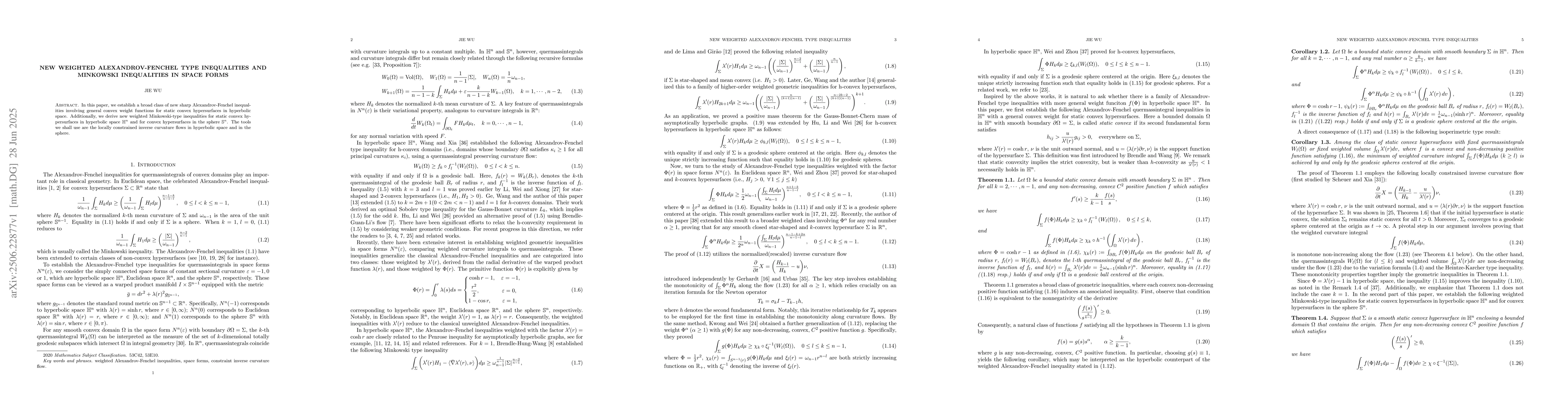 In this paper, we establish a broad class of new sharp Alexandrov-Fenchel inequalities involving general convex weight functions for static convex hypersurfaces in hyperbolic space. Additionally, we derive new weighted Minkowski-type inequalities for static convex hypersurfaces in hyperbolic space $\mathbb{H}^n$ and for convex hypersurfaces in the sphere $\mathbb{S}^n$. The tools we shall use are the locally constrained inverse curvature flows in hyperbolic space and in the sphere.