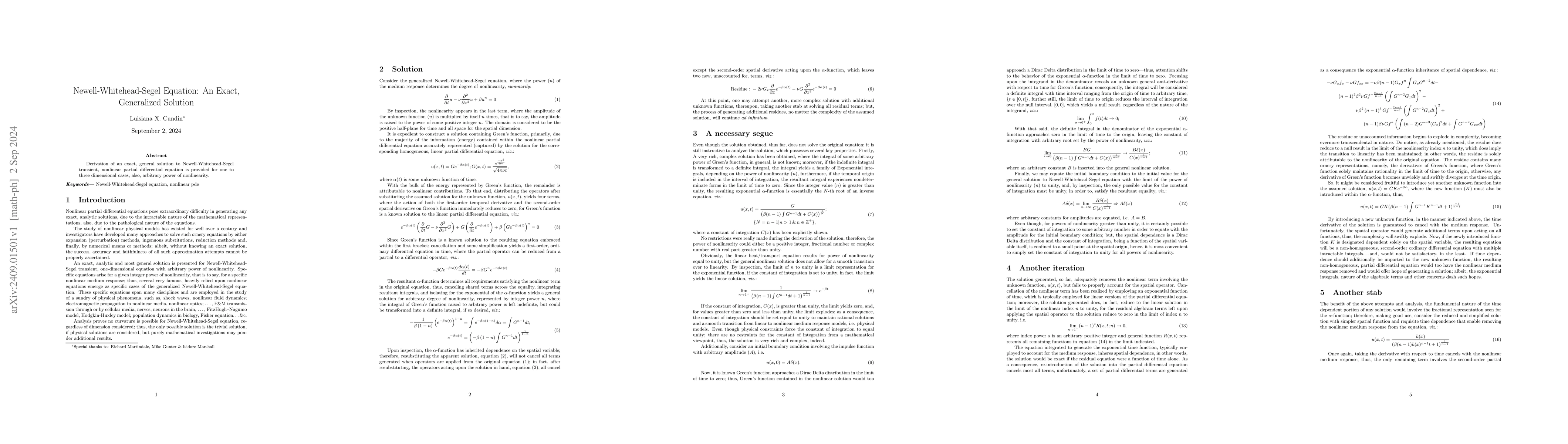 This paper presents an exact, generalized solution to the Newell-Whitehead-Segel equation for transient, nonlinear partial differential equations in one to three dimensions and for various nonlinearities. The methodology applies to a wide range of scenarios with different nonlinear power terms.