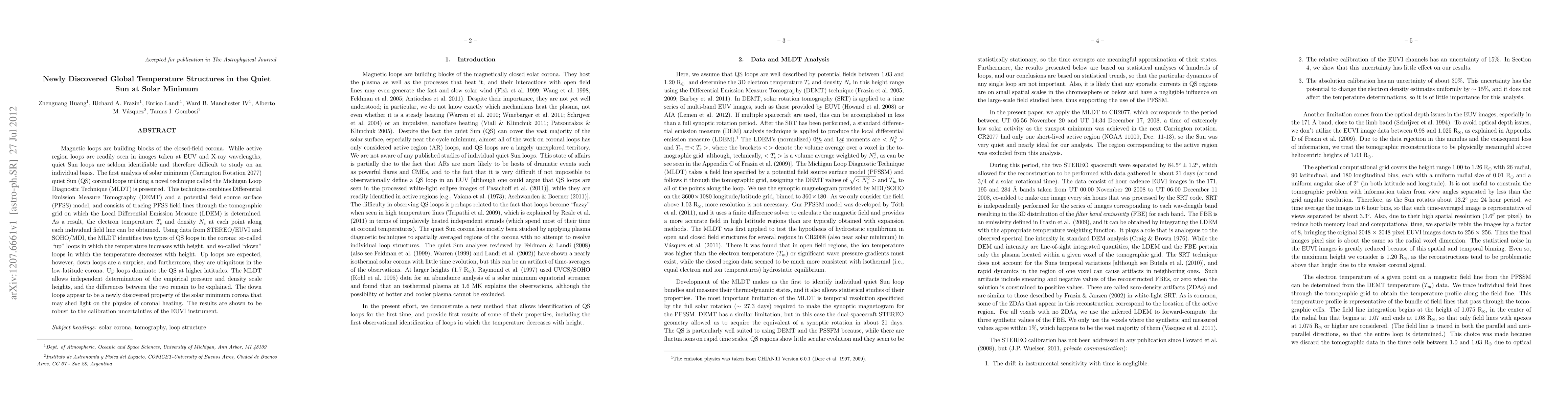 The research introduces the Michigan Loop Diagnostic Technique (MLDT) to analyze quiet Sun coronal loops at solar minimum, revealing two types: 'up' loops with increasing temperature with height, and surprisingly, 'down' loops with decreasing temperature. These findings, derived from STEREO/EUVI and SOHO/MDI data, suggest a new property of the solar corona crucial for understanding coronal heating.