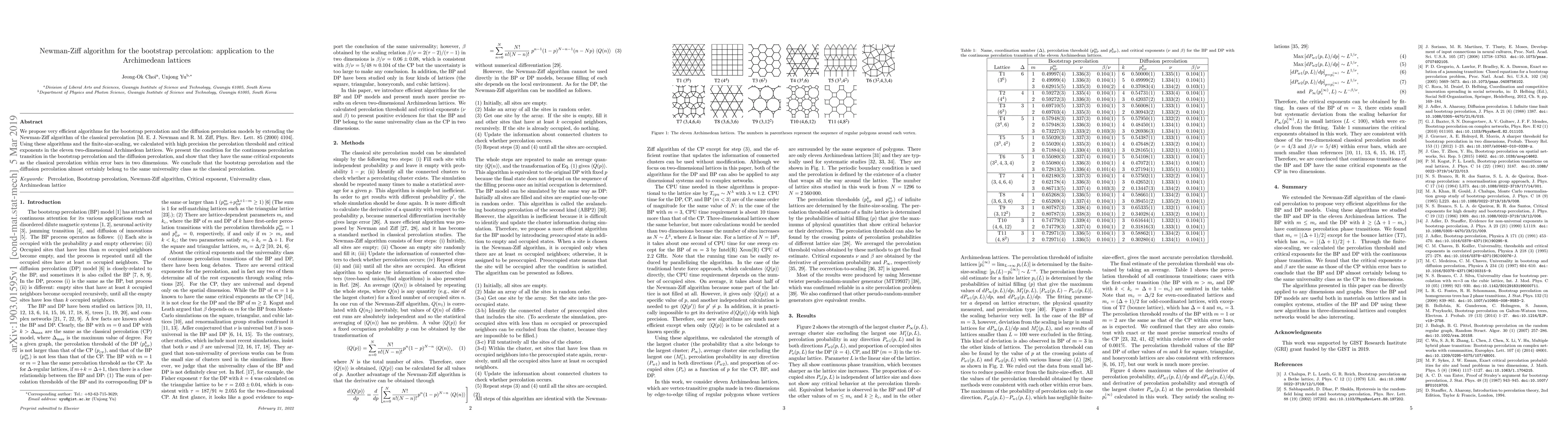 This paper proposes efficient algorithms for bootstrap and diffusion percolation models based on the Newman-Ziff algorithm, and uses them to calculate percolation thresholds and critical exponents in Archimedean lattices. The study finds that these percolation models share critical exponents with classical percolation, suggesting they belong to the same universality class.