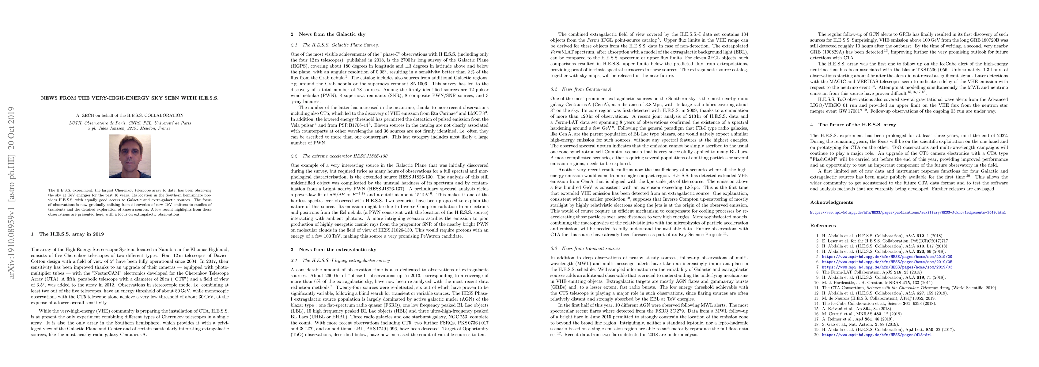 The H.E.S.S. experiment has been observing the sky at TeV energies for over a decade, shifting focus from new discoveries to detailed studies of known sources, particularly extragalactic transients. Recent highlights include significant findings from extragalactic observations.