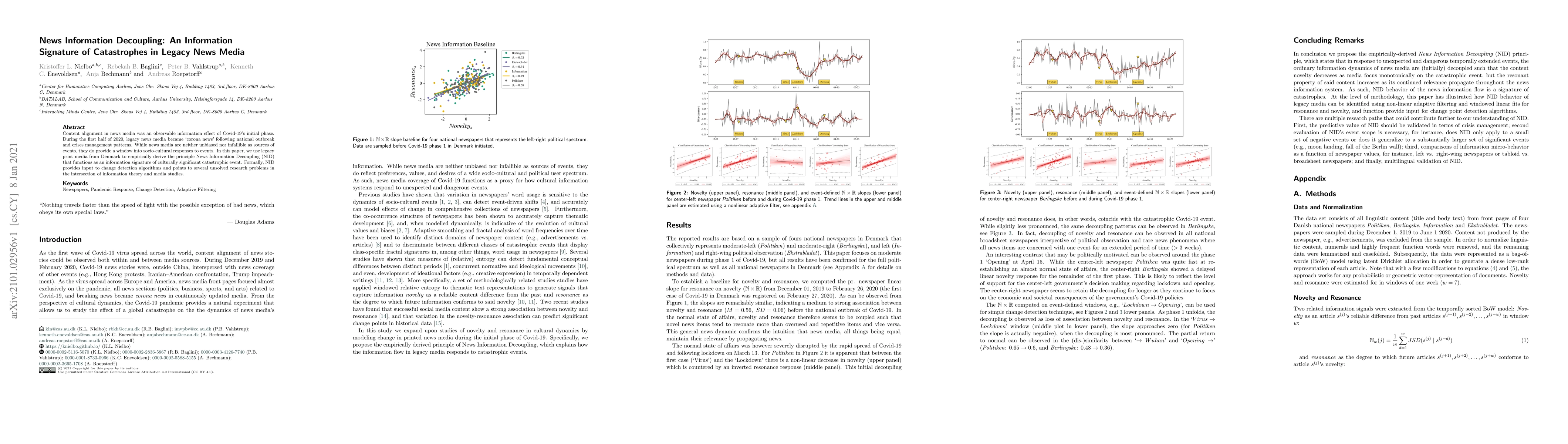 The paper introduces the concept of News Information Decoupling (NID) observed in legacy print media during the Covid-19 pandemic, highlighting its role as an information signature of catastrophic events. NID can inform change detection algorithms and points to research opportunities at the intersection of information theory and media studies.