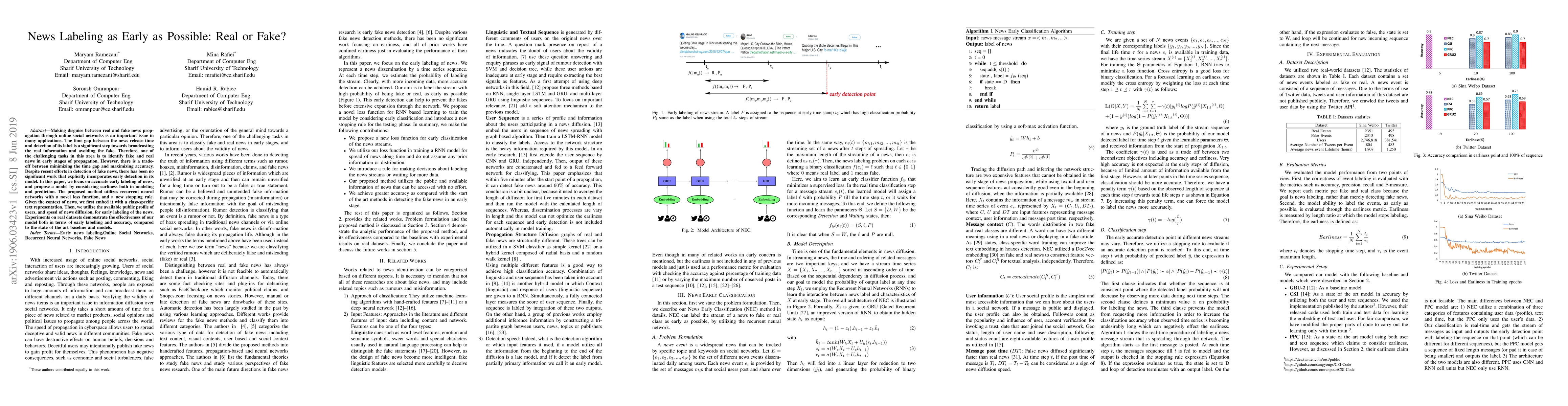 Making disguise between real and fake news propagation through online social networks is an important issue in many applications. The time gap between the news release time and detection of its label is a significant step towards broadcasting the real information and avoiding the fake. Therefore, one of the challenging tasks in this area is to identify fake and real news in early stages of propagation. However, there is a trade-off between minimizing the time gap and maximizing accuracy. Despite recent efforts in detection of fake news, there has been no significant work that explicitly incorporates early detection in its model. In this paper, we focus on accurate early labeling of news, and propose a model by considering earliness both in modeling and prediction. The proposed method utilizes recurrent neural networks with a novel loss function, and a new stopping rule. Given the context of news, we first embed it with a class-specific text representation. Then, we utilize the available public profile of users, and speed of news diffusion, for early labeling of the news. Experiments on real datasets demonstrate the effectiveness of our model both in terms of early labelling and accuracy, compared to the state of the art baseline and models.