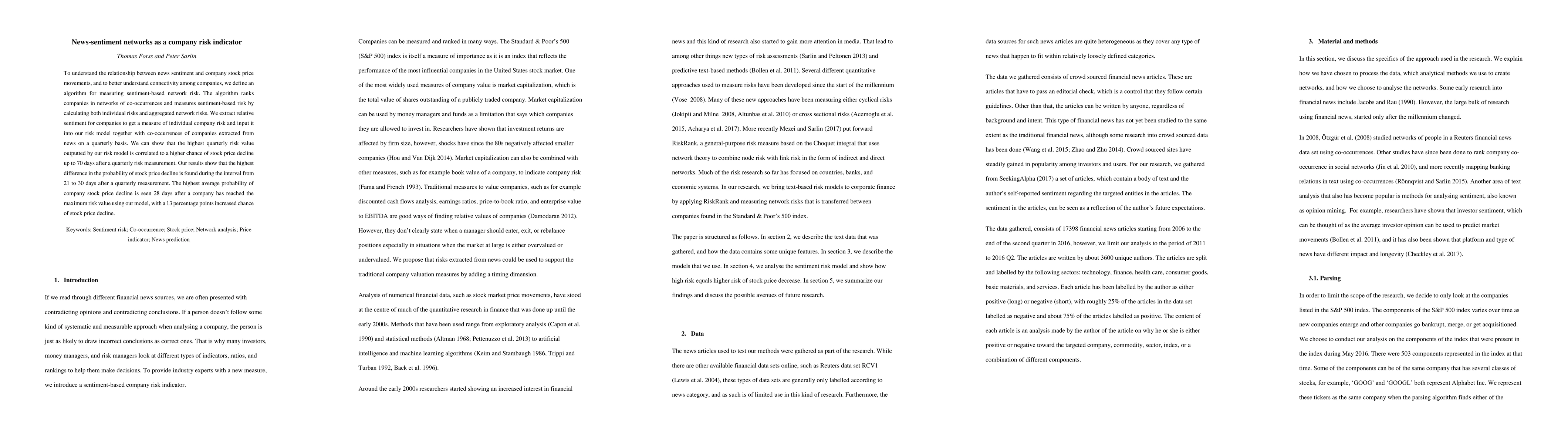 This paper develops an algorithm to measure sentiment-based network risk among companies using news sentiment and co-occurrence data. The model correlates high quarterly risk values with a higher likelihood of stock price declines up to 70 days later, with the greatest risk impact observed 21 to 30 days post-measurement.