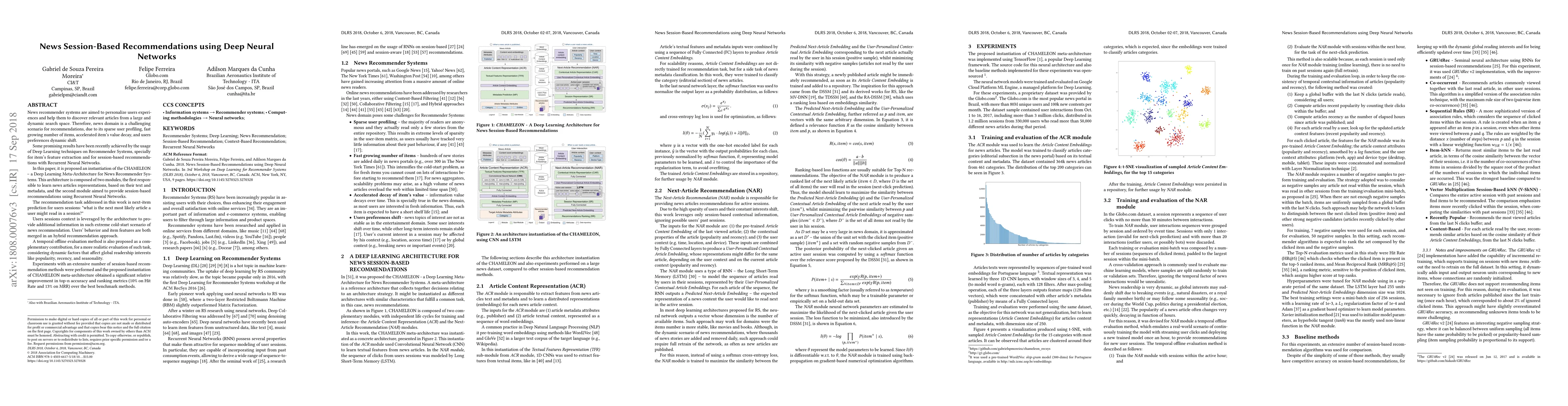 This paper proposes CHAMELEON, a Deep Learning Meta-Architecture for session-based news recommendation, utilizing two modules: one for learning article representations and another for next-item prediction using Recurrent Neural Networks. The architecture significantly improves top-n accuracy and ranking metrics over benchmark methods.