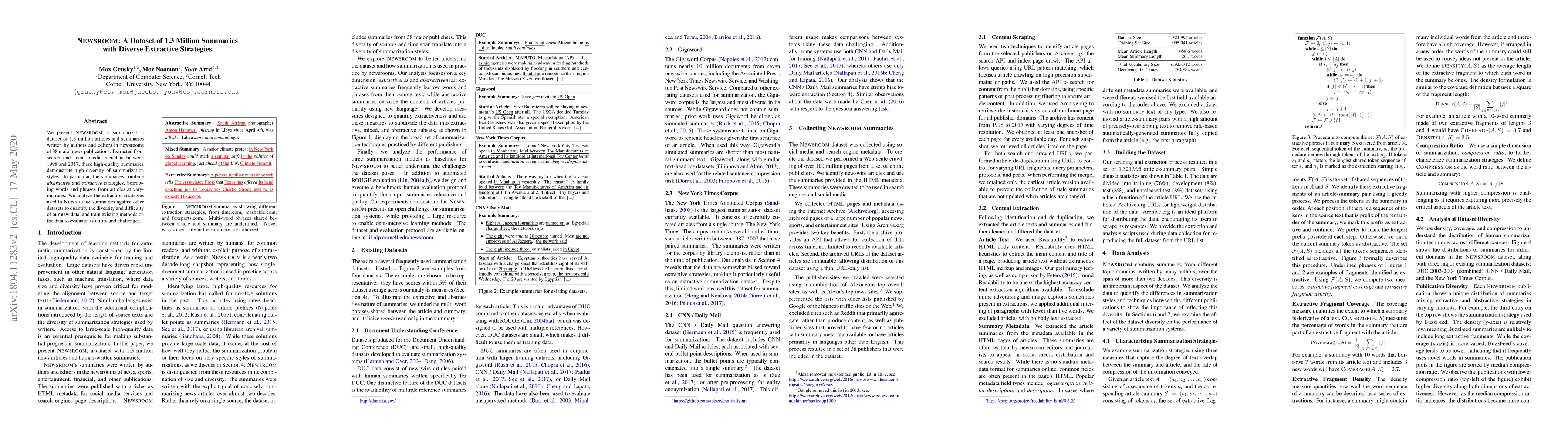 Researchers present NEWSROOM, a dataset of 1.3 million summaries with diverse extractive strategies, demonstrating high-quality summarization styles from major news publications between 1998 and 2017.