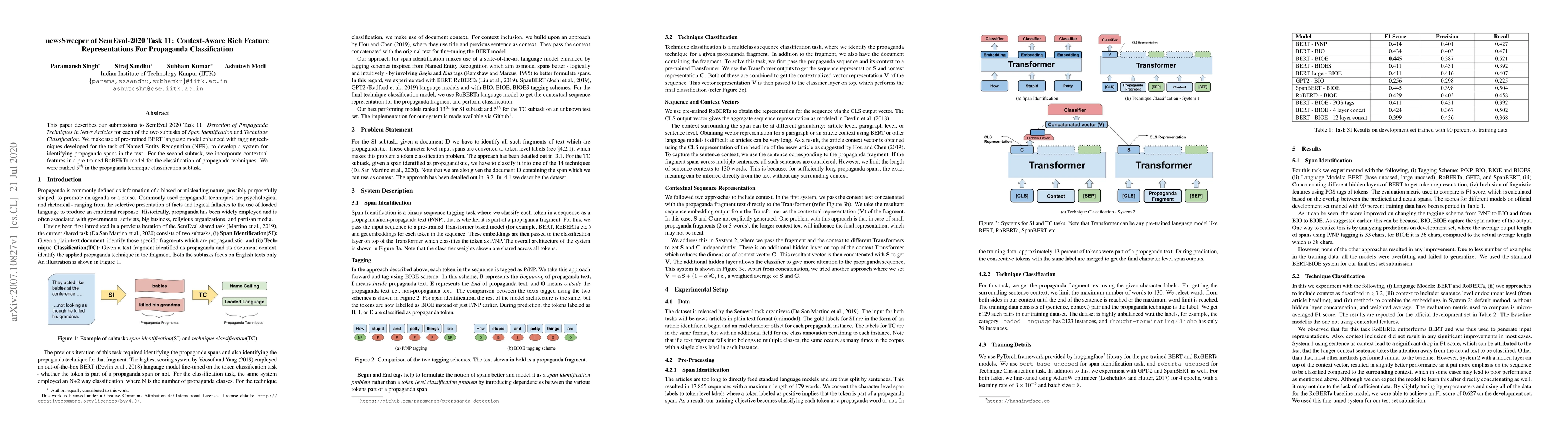 This paper describes our submissions to SemEval 2020 Task 11: Detection of Propaganda Techniques in News Articles for each of the two subtasks of Span Identification and Technique Classification. We make use of pre-trained BERT language model enhanced with tagging techniques developed for the task of Named Entity Recognition (NER), to develop a system for identifying propaganda spans in the text. For the second subtask, we incorporate contextual features in a pre-trained RoBERTa model for the classification of propaganda techniques. We were ranked 5th in the propaganda technique classification subtask.
