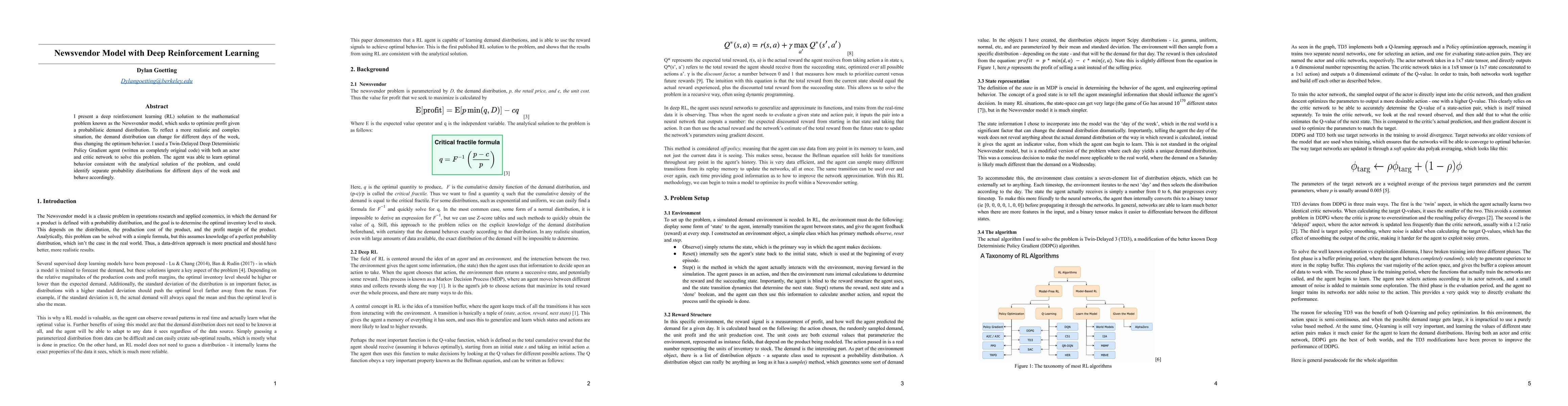 I present a deep reinforcement learning (RL) solution to the mathematical problem known as the Newsvendor model, which seeks to optimize profit given a probabilistic demand distribution. To reflect a more realistic and complex situation, the demand distribution can change for different days of the week, thus changing the optimum behavior. I used a Twin-Delayed Deep Deterministic Policy Gradient agent (written as completely original code) with both an actor and critic network to solve this problem. The agent was able to learn optimal behavior consistent with the analytical solution of the problem, and could identify separate probability distributions for different days of the week and behave accordingly.